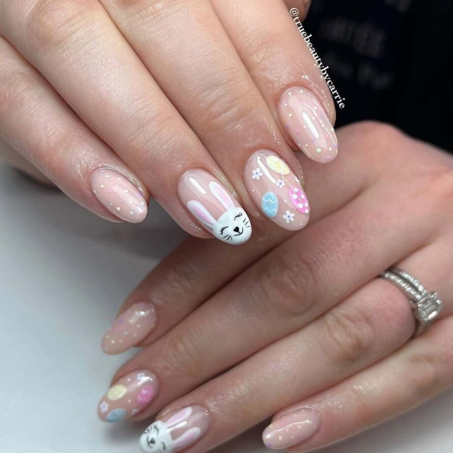 Tiny bunny accents paired with pastel confetti dots create a light and airy feel for this nail set. The design is understated, with each nail adding a subtle touch of charm.