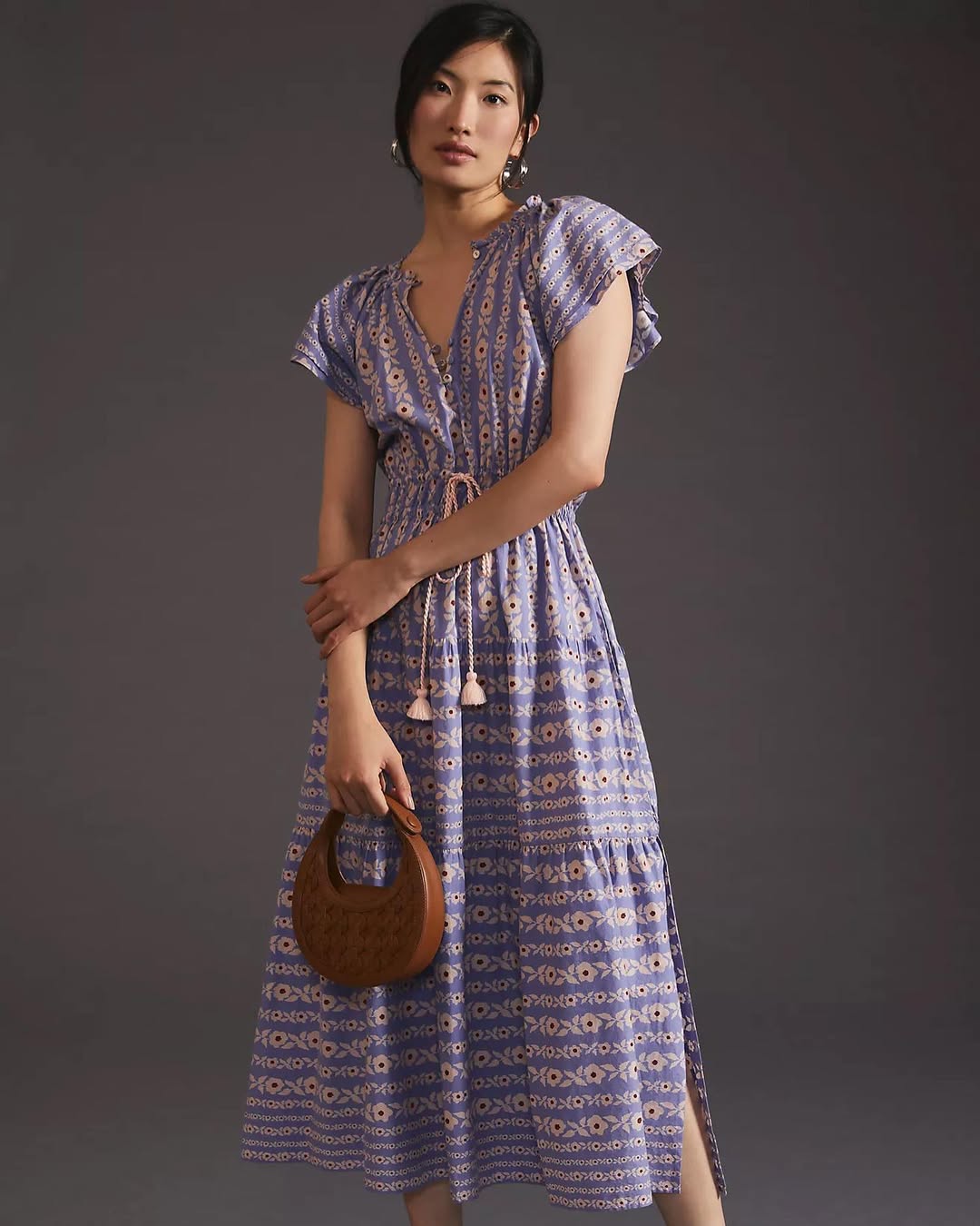 This printed midi dress offers a handcrafted, travel-inspired aesthetic. The tassel tie and soft drape contribute to a relaxed feel, while a subtle slit maintains a modern, breathable design.