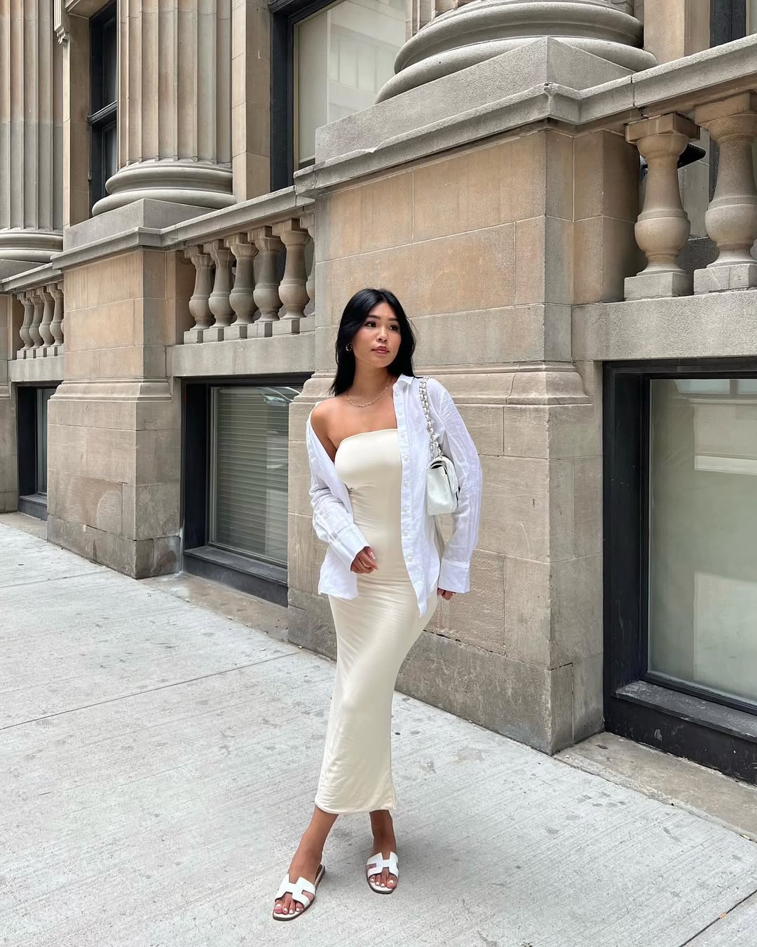 A fitted cream midi dress layered with an oversized white shirt offers a look that is clean, modern, and effortlessly cool. The neutral color palette ensures a refined appearance, while the relaxed outer layer balances the formality.