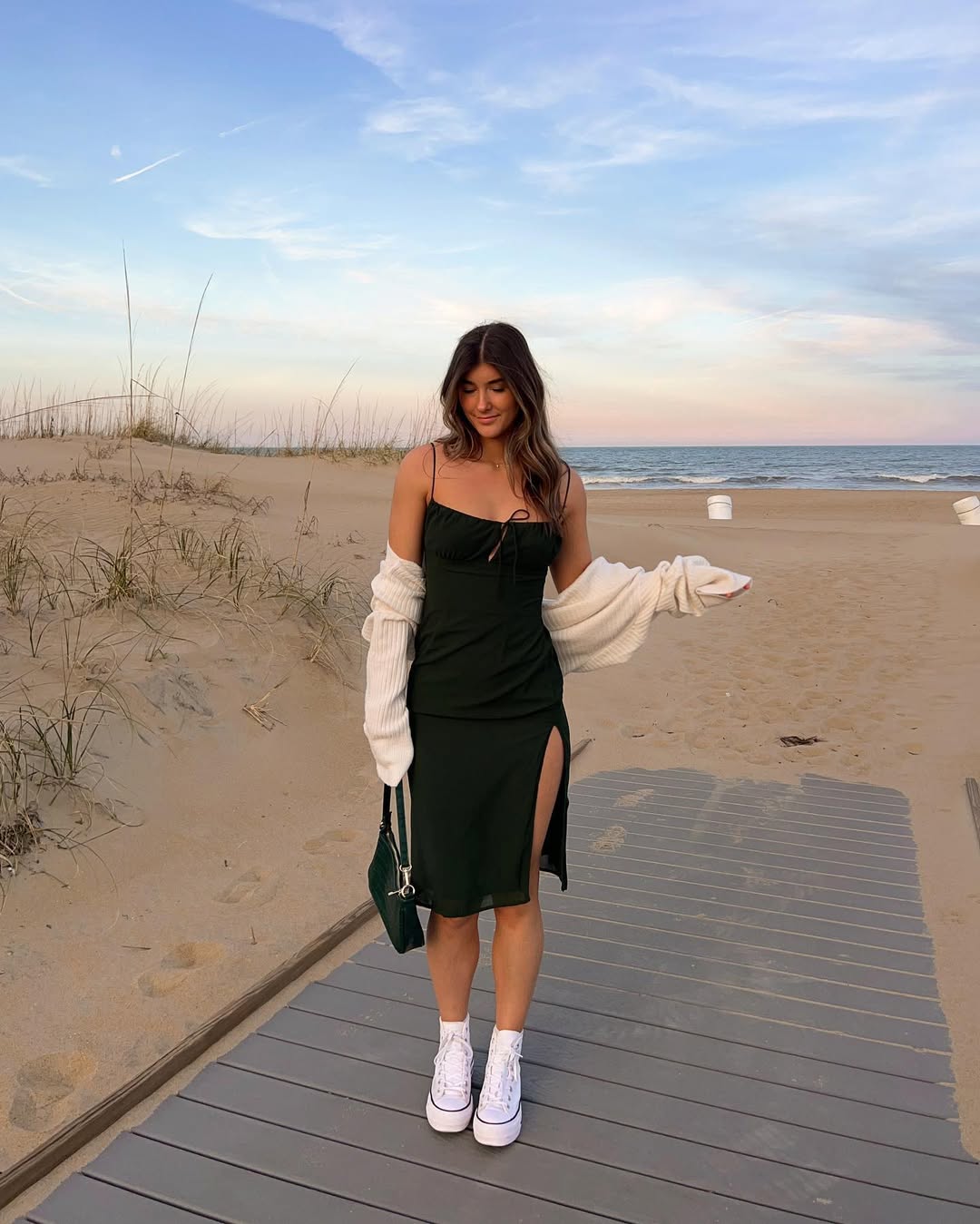 A sleek black midi dress featuring a subtle slit, layered with a cozy cardigan and crisp white sneakers, perfectly captures beachside chic without appearing contrived. The silhouette is clean and minimal, but the styling injects personality.