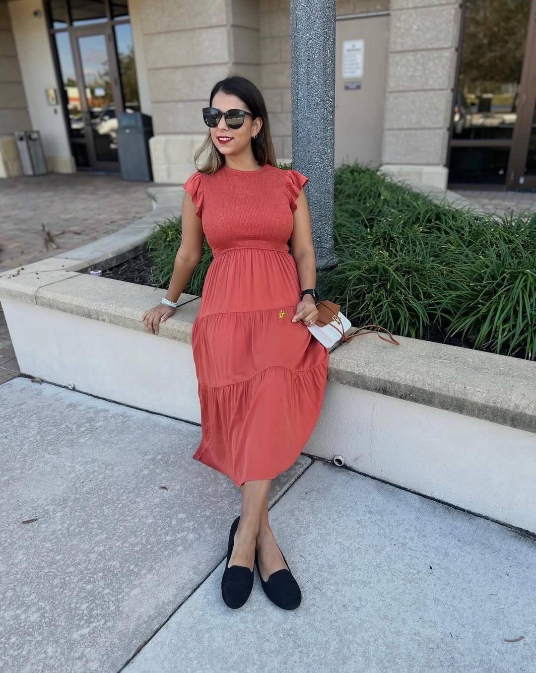 This rust-colored midi dress is the quintessential throw-on-and-go piece. The smocked bodice and soft flutter sleeves provide definition without appearing overly styled, while the tiered skirt ensures a breezy, comfortable fit. When combined with simple black flats and oversized sunglasses, it creates an instantly polished casual ensemble.
