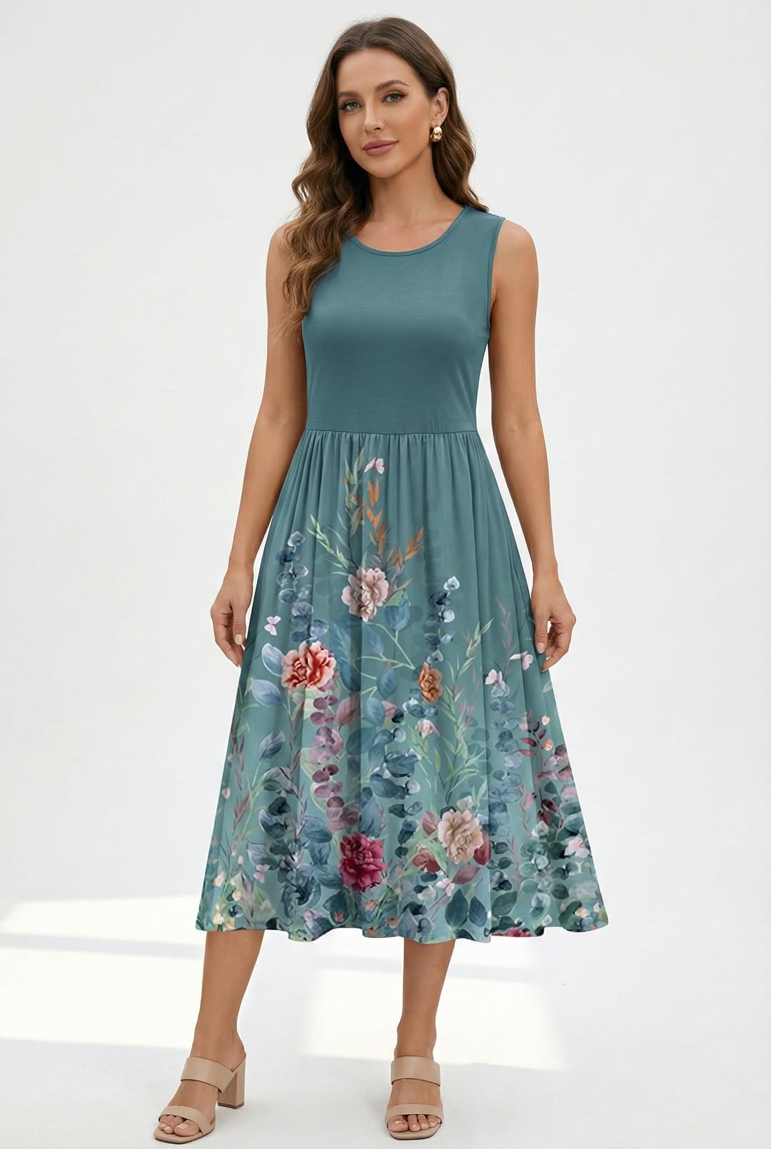 A floral midi dress with a soft silhouette is always a reliable choice. The delicate print and gentle slit provide movement, while sneakers keep the overall look grounded and practical for daily wear.