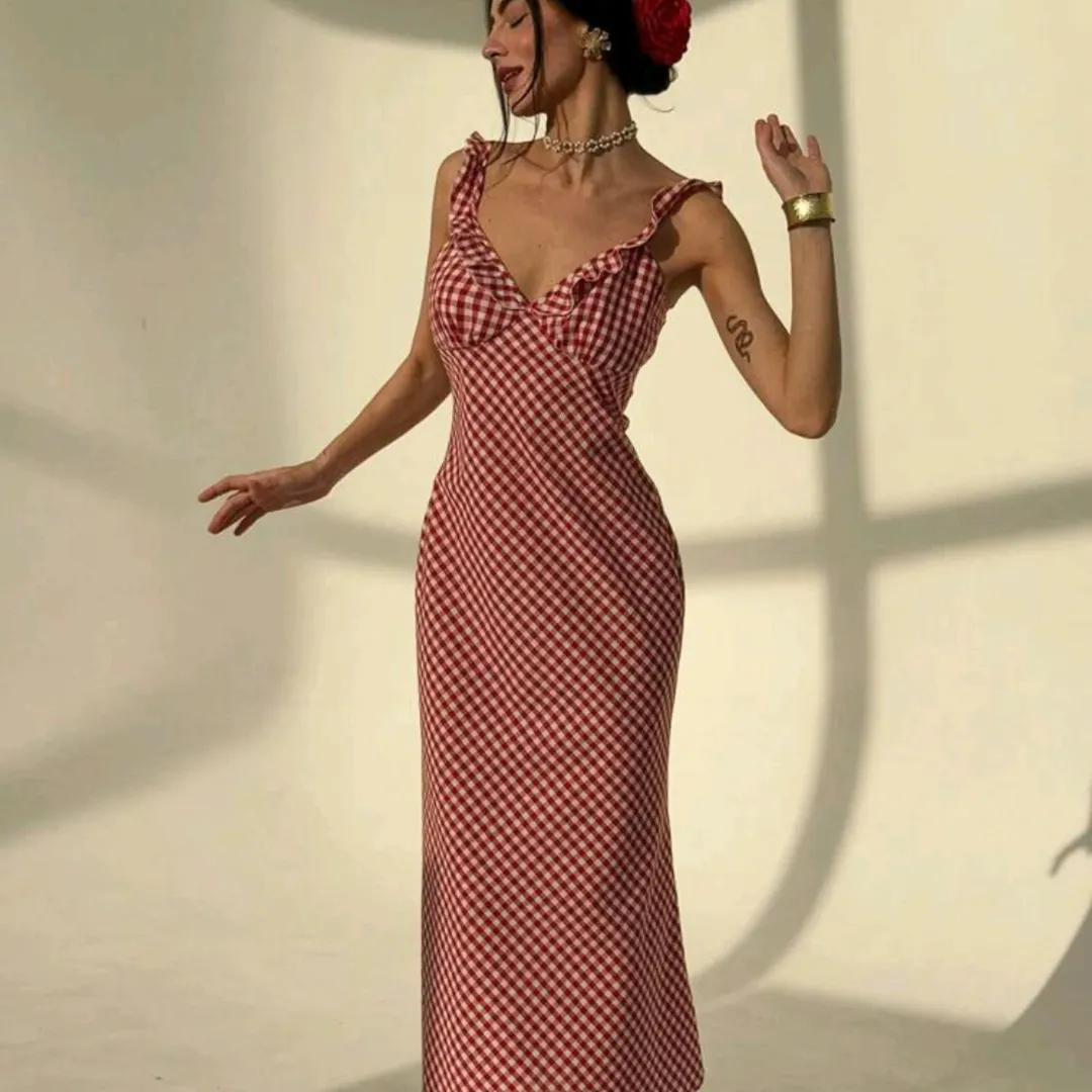 This red gingham midi dress brings a flirty energy with its fitted silhouette and ruffled neckline. It’s a bold choice that remains highly wearable, especially when styled with simple accents.