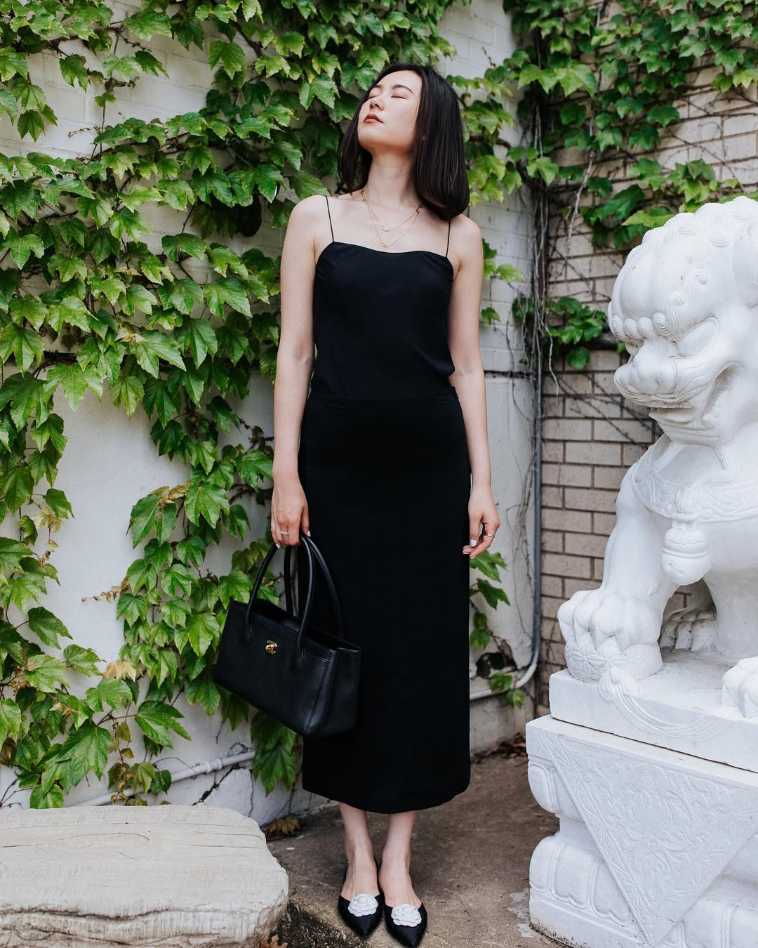 The simple black slip dress, when executed perfectly, exudes an effortless sense of sophistication. Its clean lines, delicate straps, and midi length create a minimalist yet impactful silhouette. Paired with classic pointed flats and a structured black bag, it conveys a sense of refined taste achieved without visible effort.