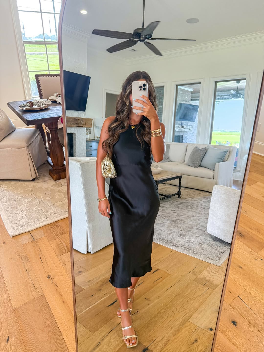 This silky black midi dress brings a touch of soft glamour to everyday settings. The fluid fabric drapes beautifully, and when styled with gold sandals and statement jewelry, it achieves an instant polished look.