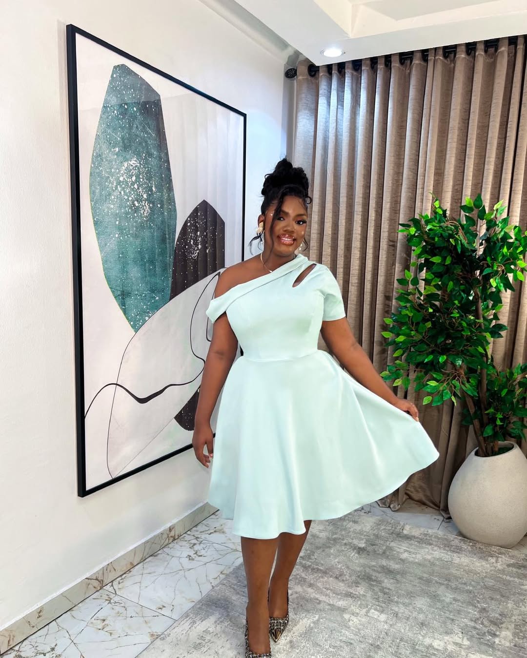 This mint one-shoulder dress exudes main character energy. The asymmetrical neckline adds a touch of drama, while the flared skirt maintains a playful and light feel. It’s feminine, fun, and bold enough to capture attention without appearing overly styled.