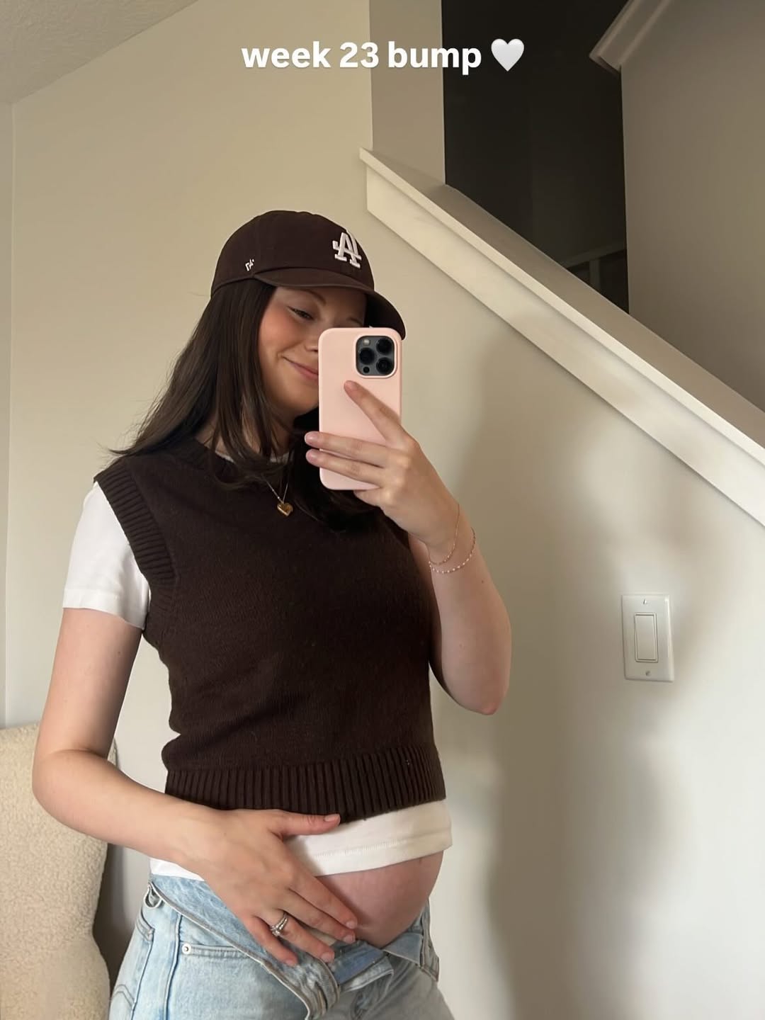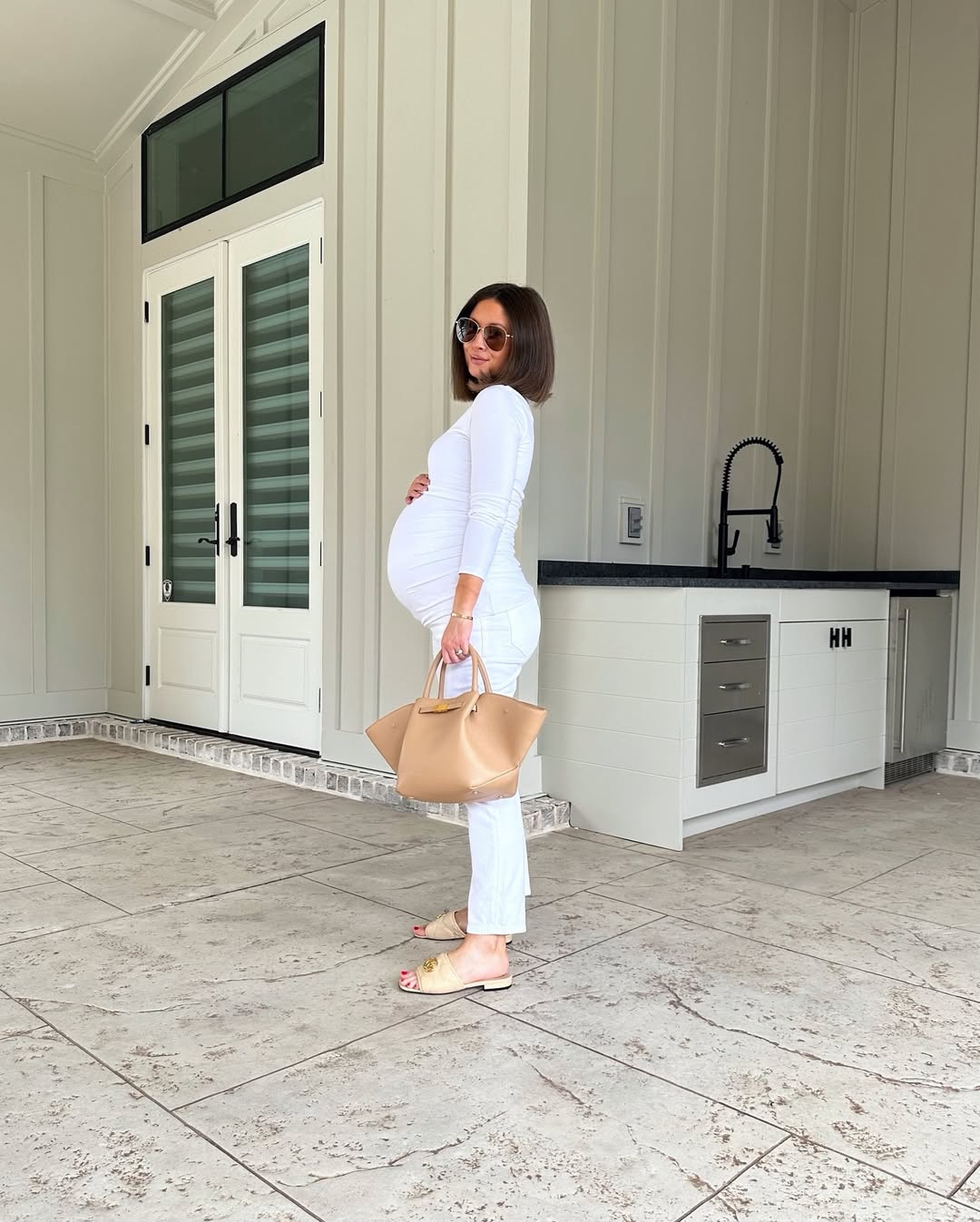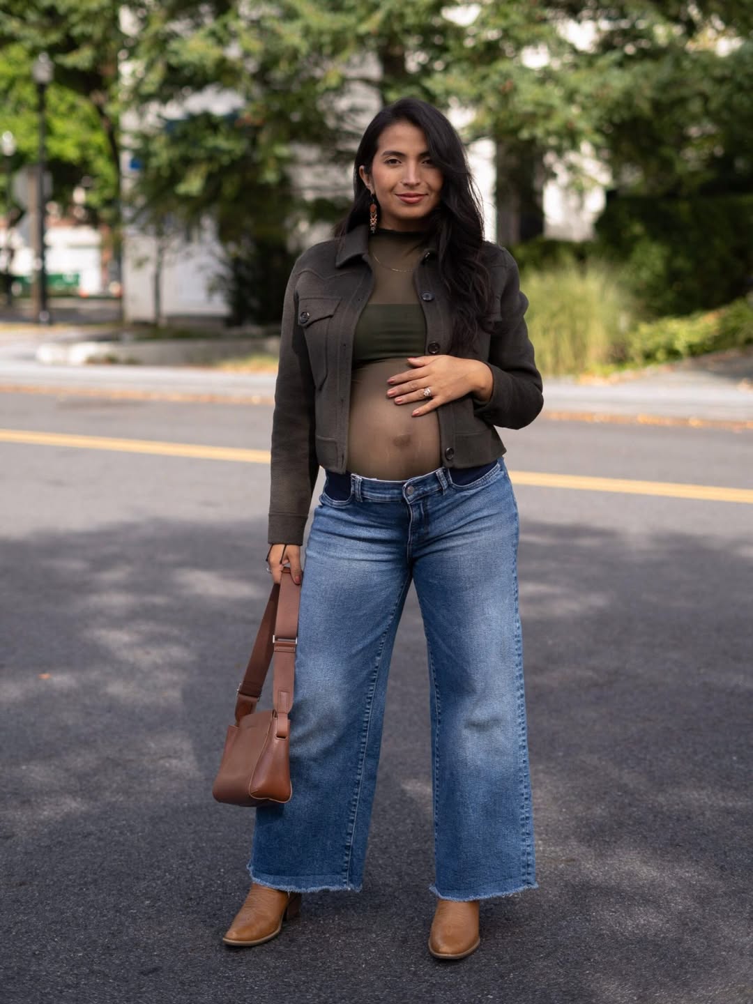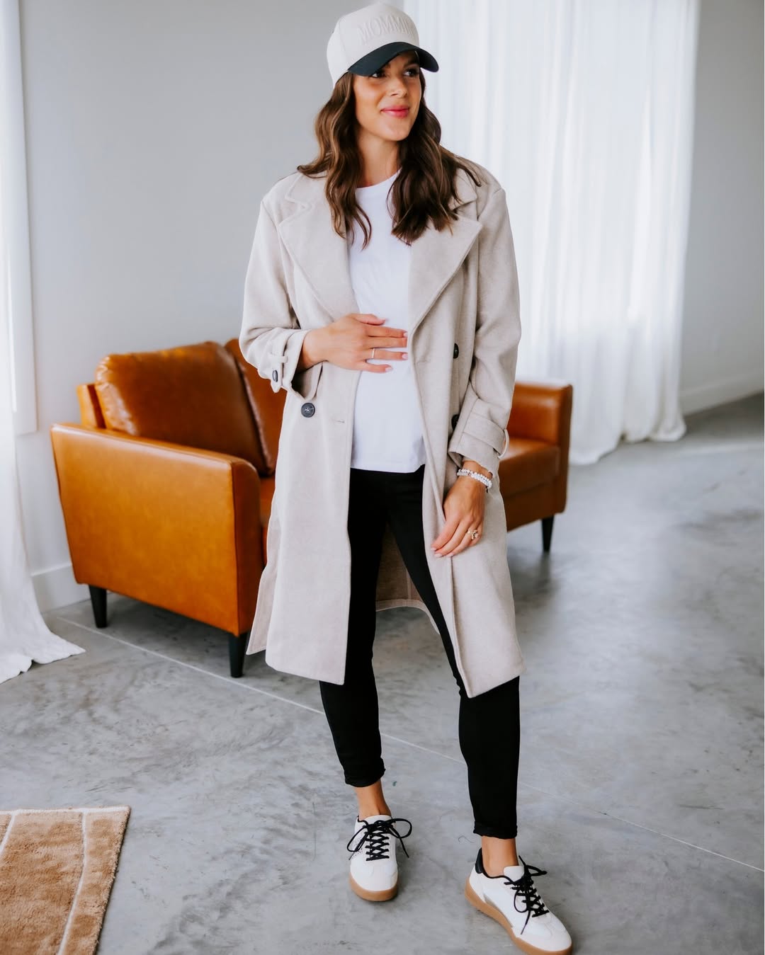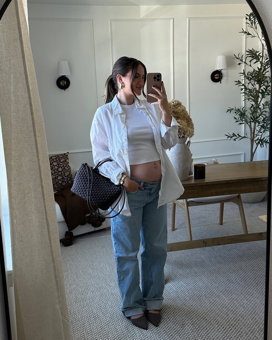 It’s a subtly stylish and highly wearable look, demonstrating that pregnancy fashion can still be refined and intentionally curated.