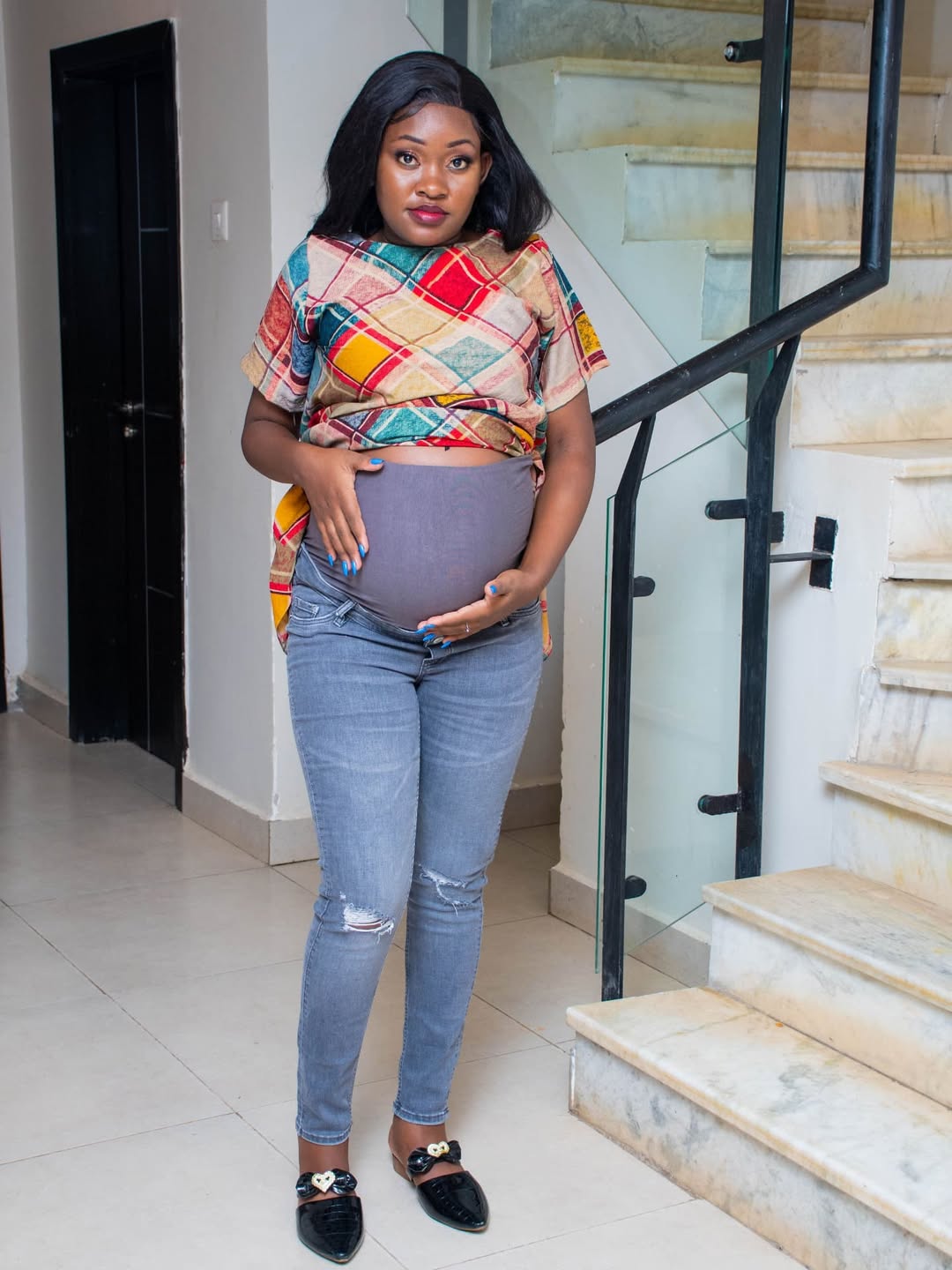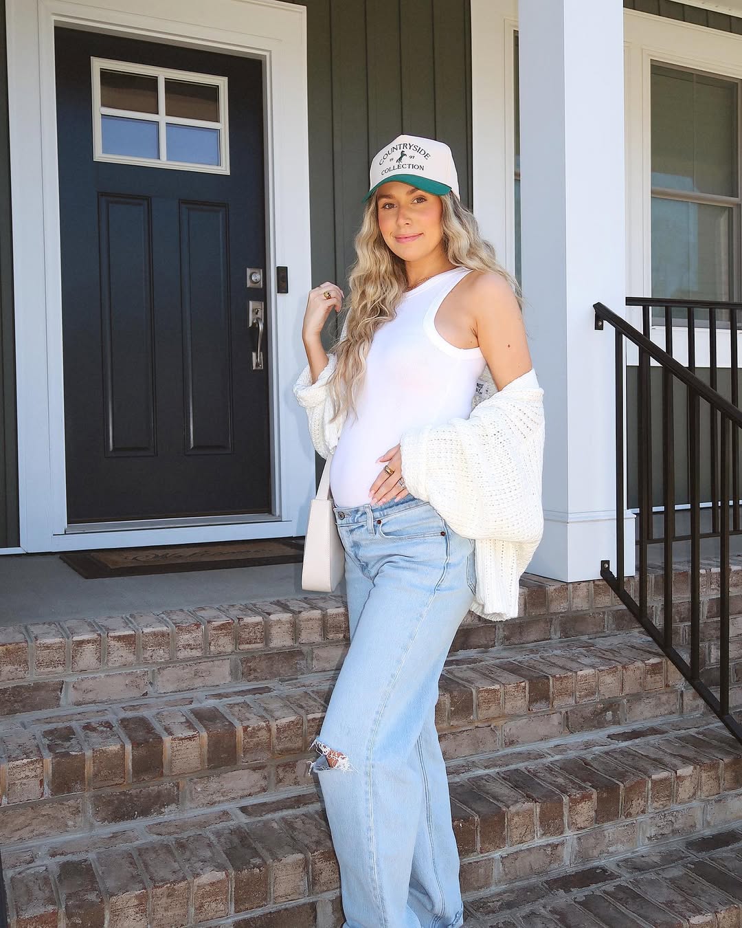 This outfit prioritizes ease and comfort. The jeans fit comfortably around the bump, contributing to a natural and lived-in feel that enhances their appeal.