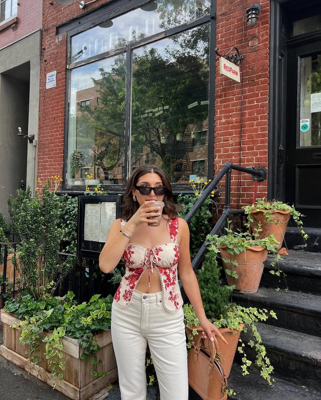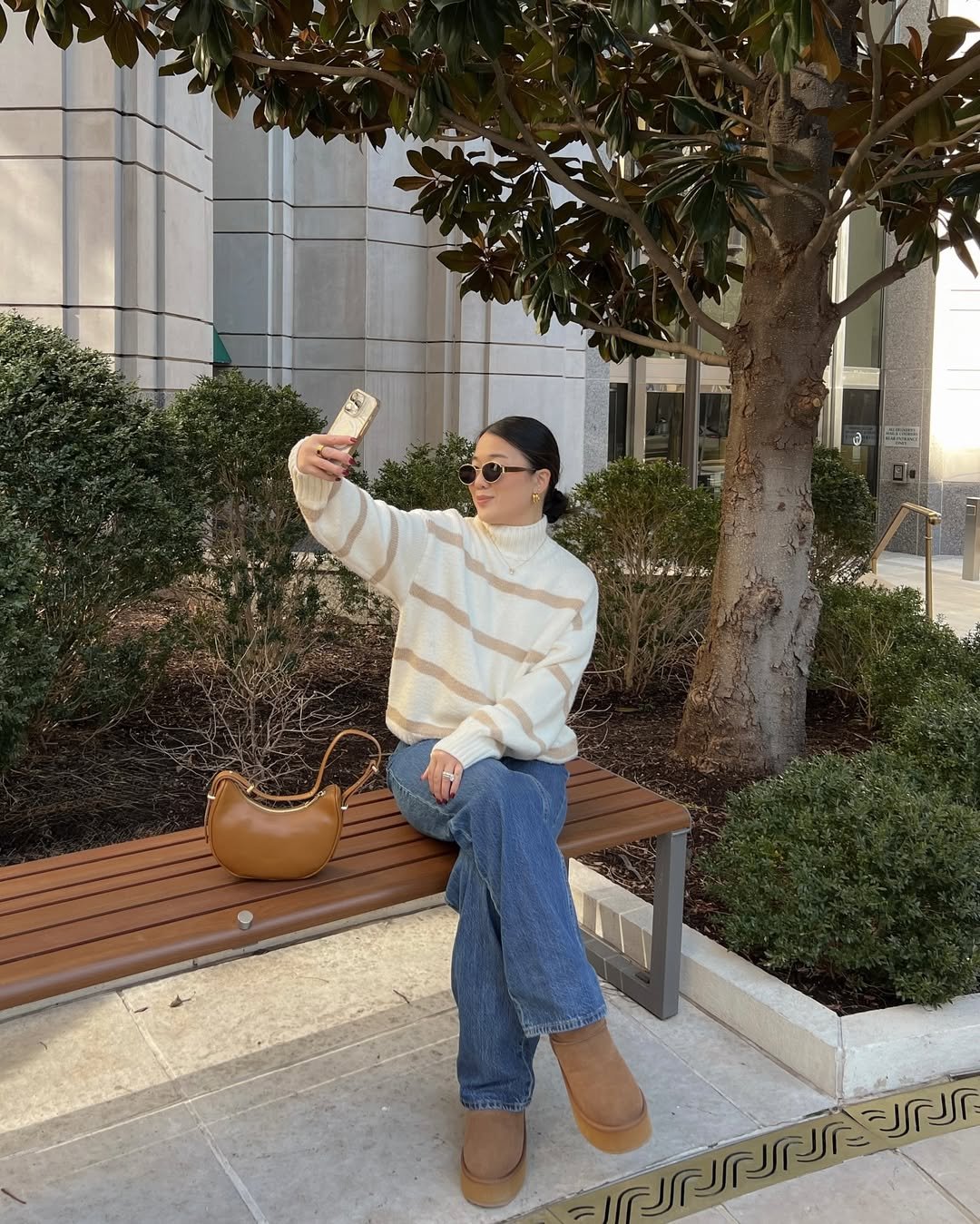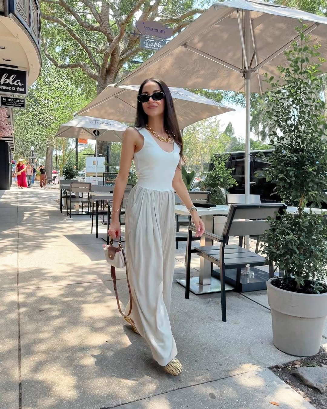 Accented with oversized sunglasses and gold jewelry, the ensemble is perfect for a sunny afternoon spent at a café. It offers an easy, sophisticated style that elevates even a simple stroll.