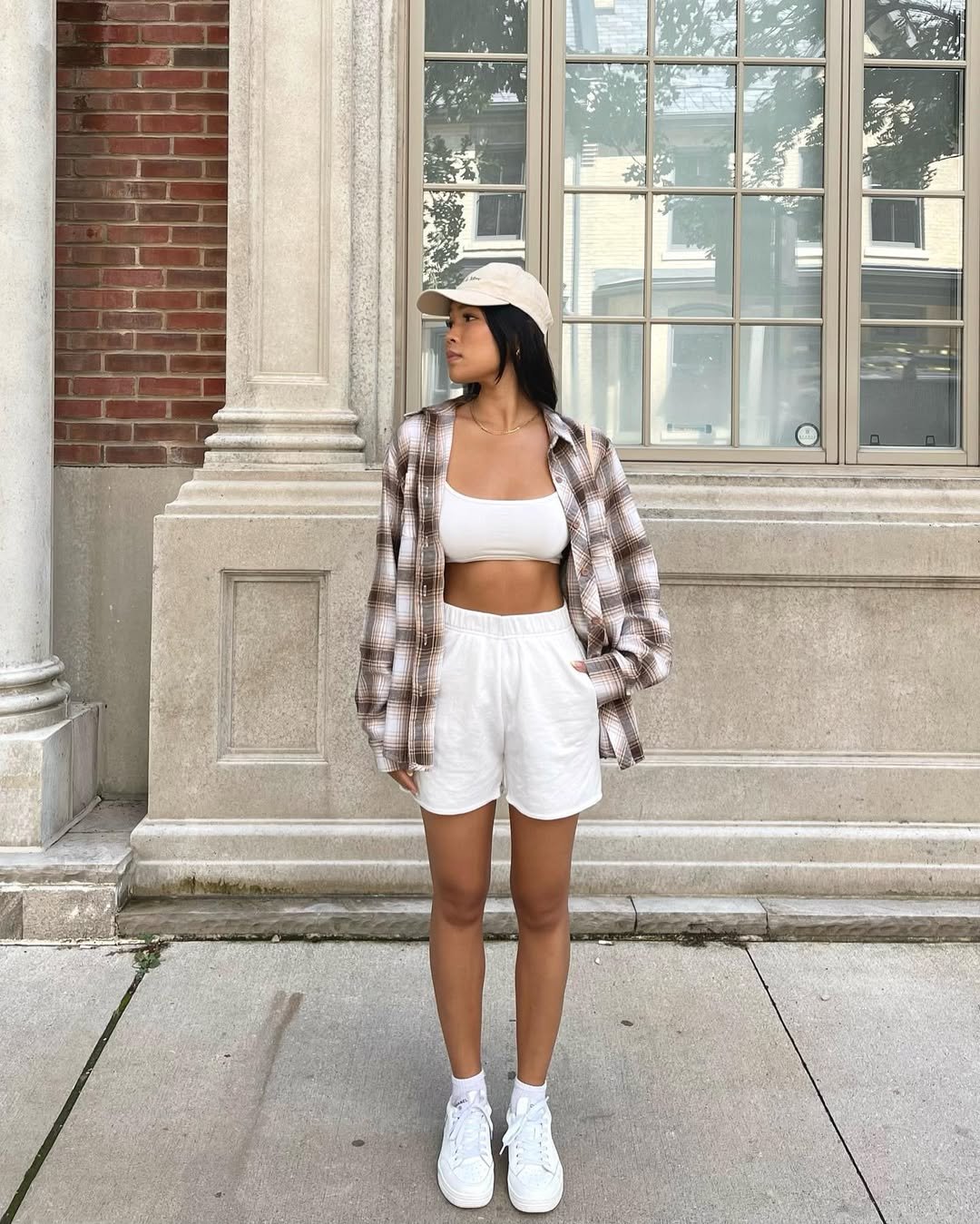 This ensemble embodies that perfectly styled yet nonchalant “just stepped out” aesthetic, ideal for casual outings. A plaid overshirt layered over a simple neutral base provides a relaxed feel, complemented by a baseball cap and clean white sneakers for an effortless off-duty vibe.