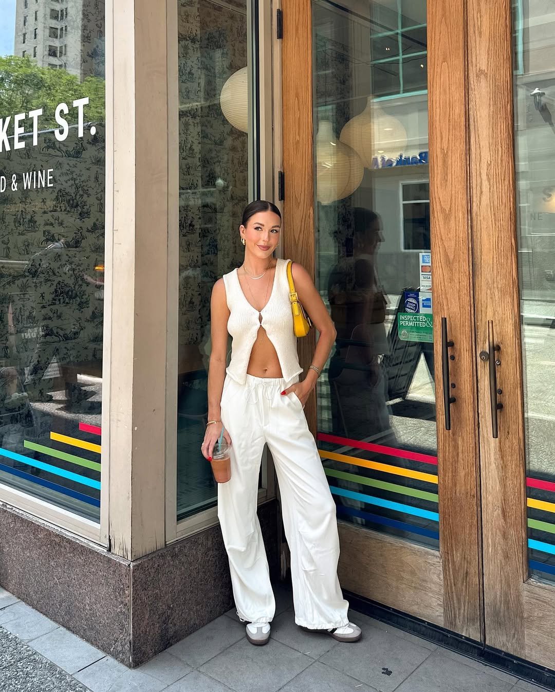 With the addition of a sleek bun and a pop of color from a yellow shoulder bag, the entire outfit appears effortlessly intentional. It’s the kind of ensemble that transitions seamlessly from a quick coffee run to brunch, errands, or even a spontaneous city walk – embodying effortless, clean, and understated style.