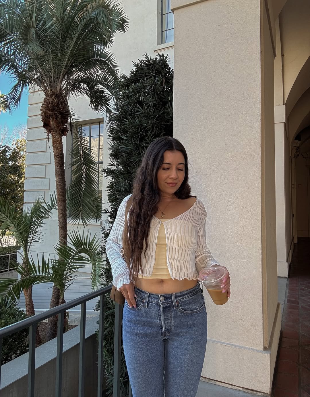 This outfit feels perfect for a warm afternoon stroll, coffee in hand. A lightweight cardigan layered over a soft yellow top keeps the look relaxed yet put-together.