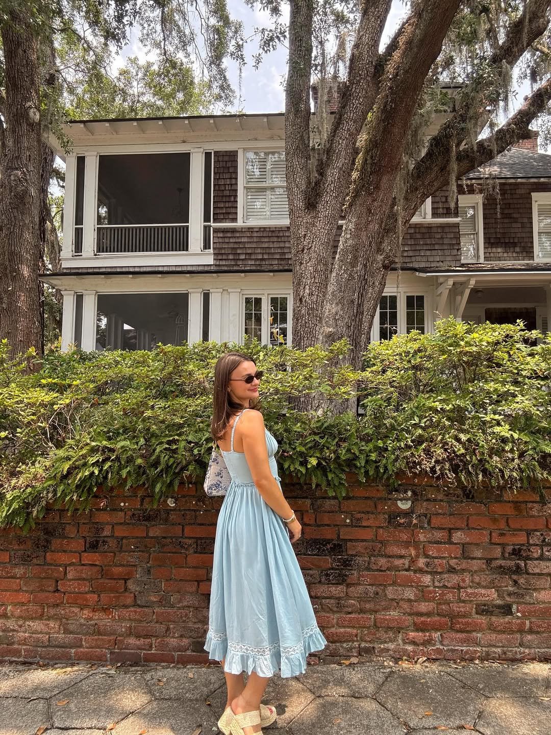 Complemented by woven espadrilles and a simple bag, the entire look feels gentle and timeless. It’s a soft, feminine choice ideal for relaxed, sunny afternoons.