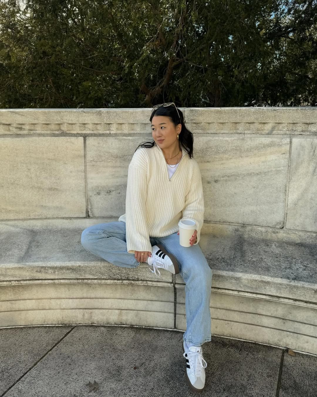 Accessorized with classic sneakers and a takeaway coffee, the look is both relaxed and intentional. It’s ideal for park walks, quick café visits, or simply enjoying a quiet afternoon outdoors.