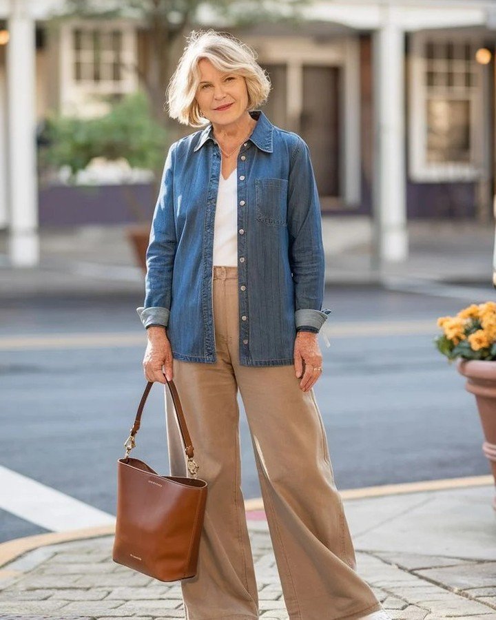 This ensemble focuses on relaxed spring layering, featuring a denim shirt and neutral wide-leg trousers. The shirt’s soft structure maintains a casual feel, while a warm-toned leather tote bag adds a refined touch.