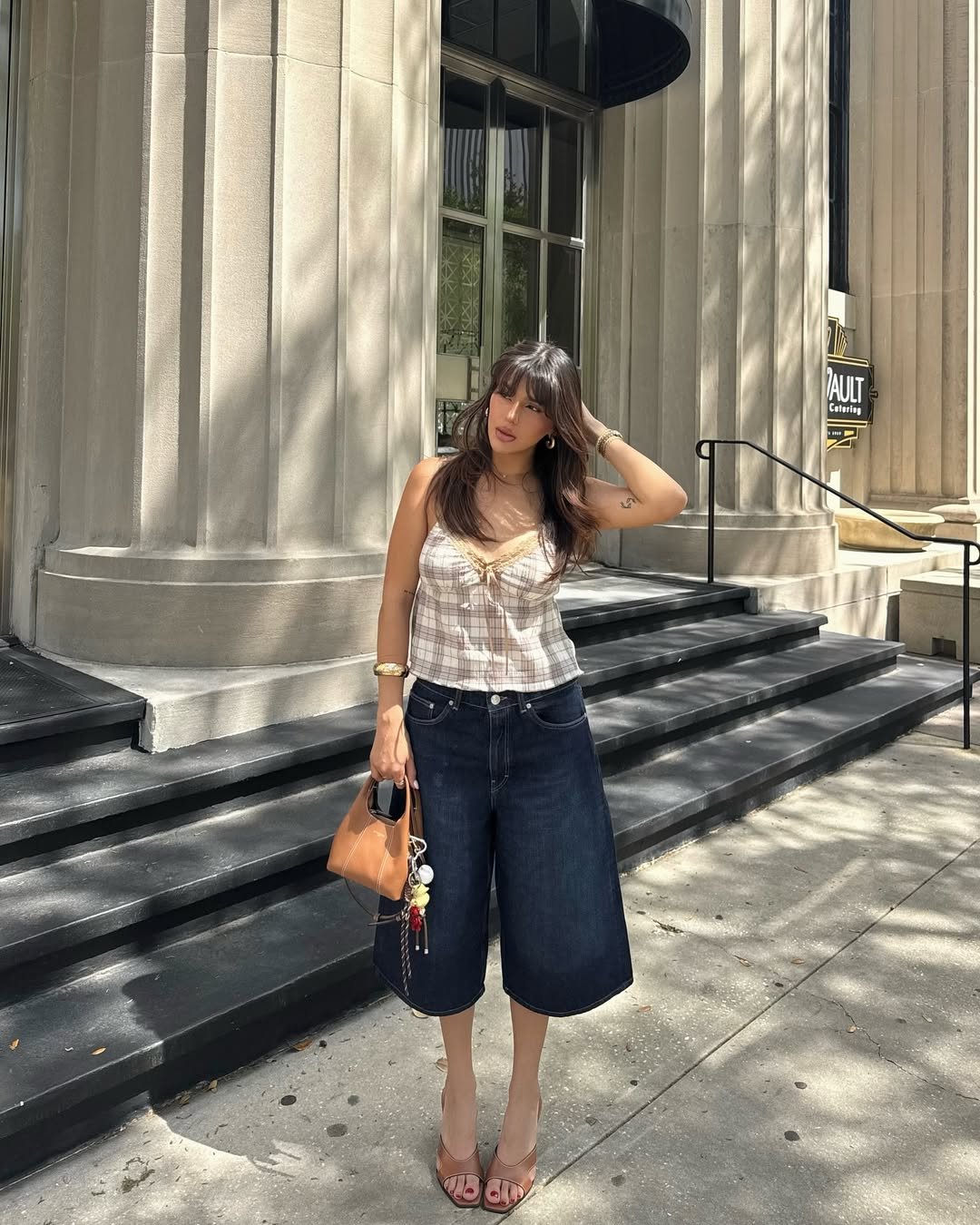 This ensemble achieves that coveted casual-chic balance. A fitted plaid camisole paired with wide-leg denim shorts creates a relaxed silhouette that still appears thoughtfully curated.