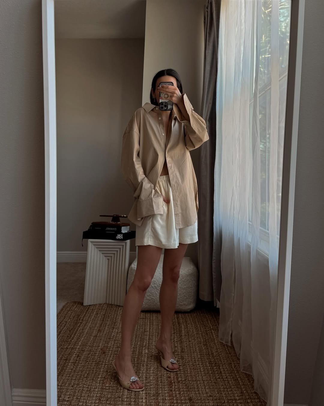 This outfit serves as an excellent example of relaxed minimalism. An oversized beige button-down shirt layered over soft shorts creates a breezy, effortless silhouette that feels both comfortable and stylish.