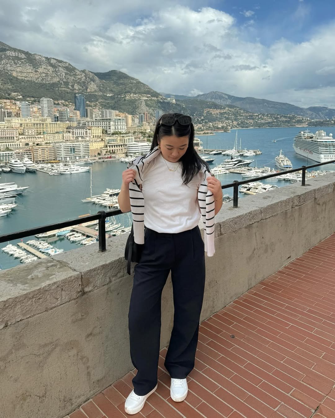 With a harbor and yachts in the background, the ensemble feels polished yet effortless. This is a perfect outfit for travel days, offering comfort for exploration while remaining stylish enough for every photo opportunity.