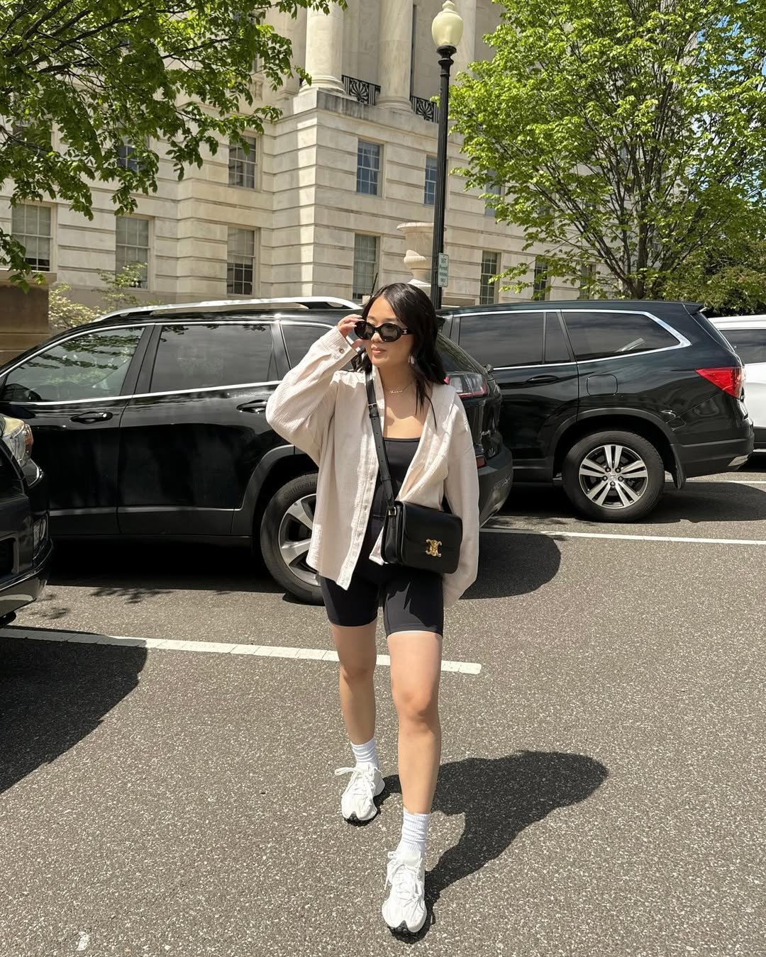 This outfit demonstrates how sporty pieces can be styled for a chic urban look. Biker shorts paired with an oversized button-down shirt create a relaxed, city-dweller aesthetic that is both comfortable and sophisticated.