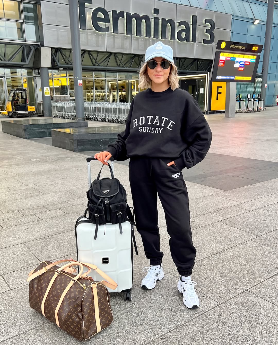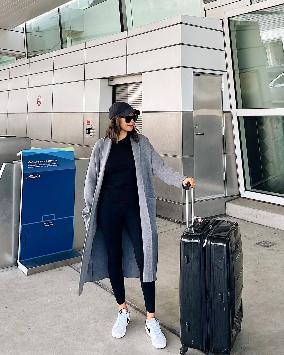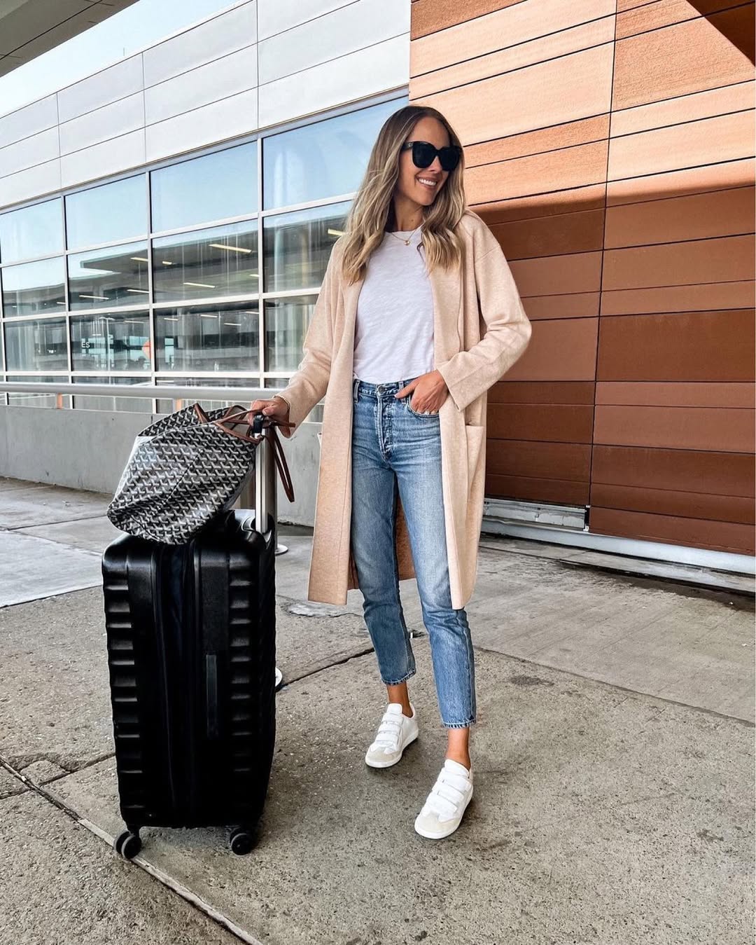 The structured tote bag and dark luggage provide a balanced contrast to the softer neutral tones. It’s a simple combination that hits all the right style notes, ensuring comfort during your flight and a sharp appearance upon arrival.