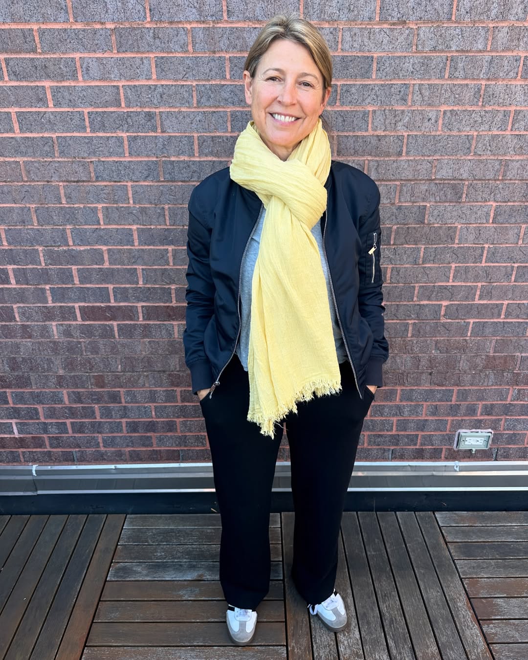 A navy bomber jacket and black trousers offer a standard base, but a soft yellow scarf introduces warmth and a gentle pop of color against a brick backdrop.