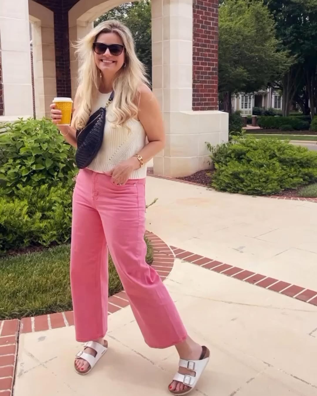 Pink cropped trousers paired with a sleeveless knit tank introduce cheerful energy, perfect for longer daylight hours. A black crossbody bag provides a grounding element.