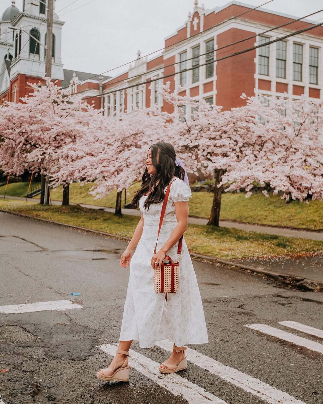 A soft white midi dress with puff sleeves, worn while walking among blooming trees, evokes a fairytale-like spring atmosphere. A woven crossbody bag with red trim provides a subtle, complementary contrast.