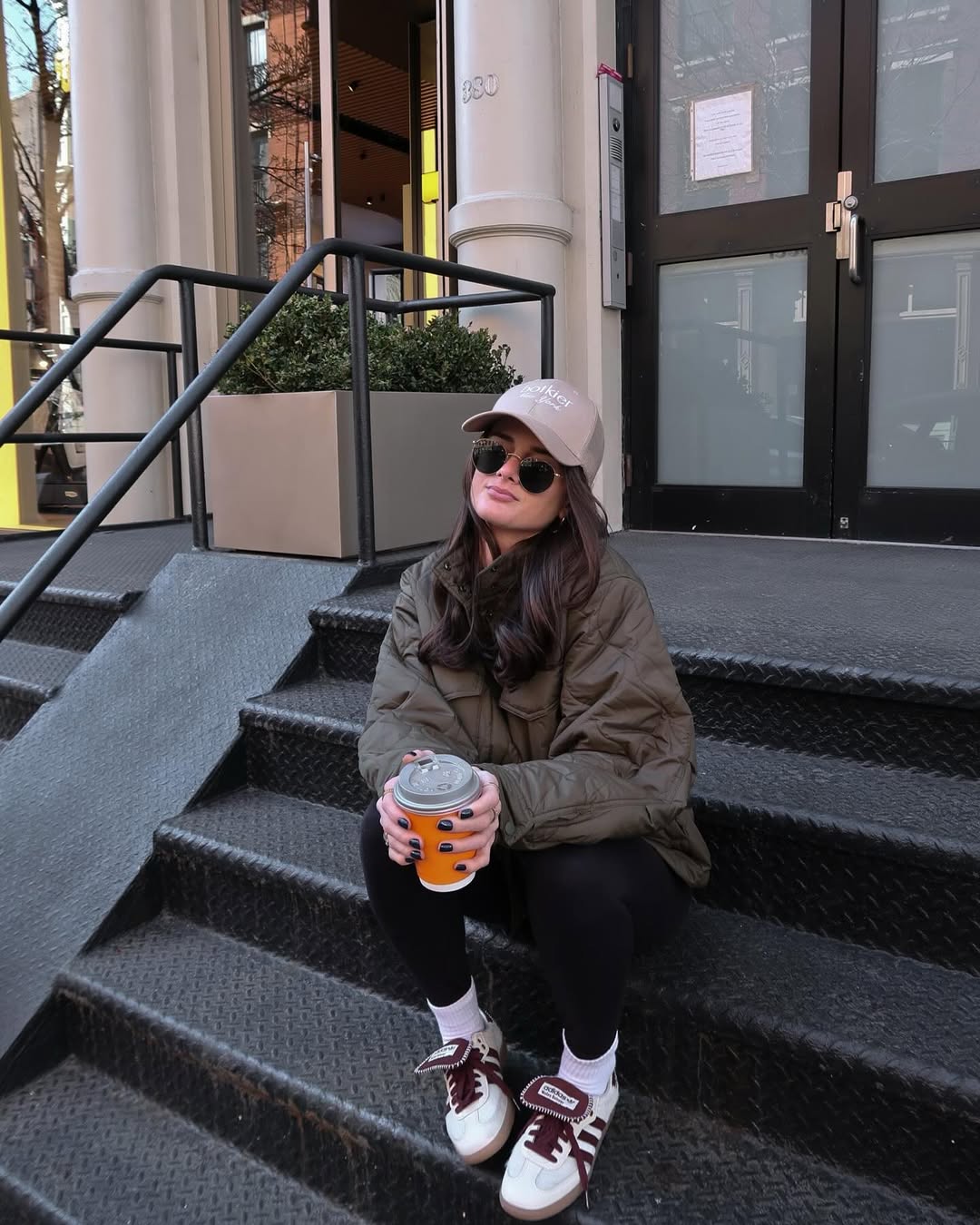 Sitting on city steps in a quilted olive jacket, black leggings, and retro sneakers creates a relatable, laid-back vibe. A baseball cap and dark sunglasses contribute to a casual, unassuming attitude.