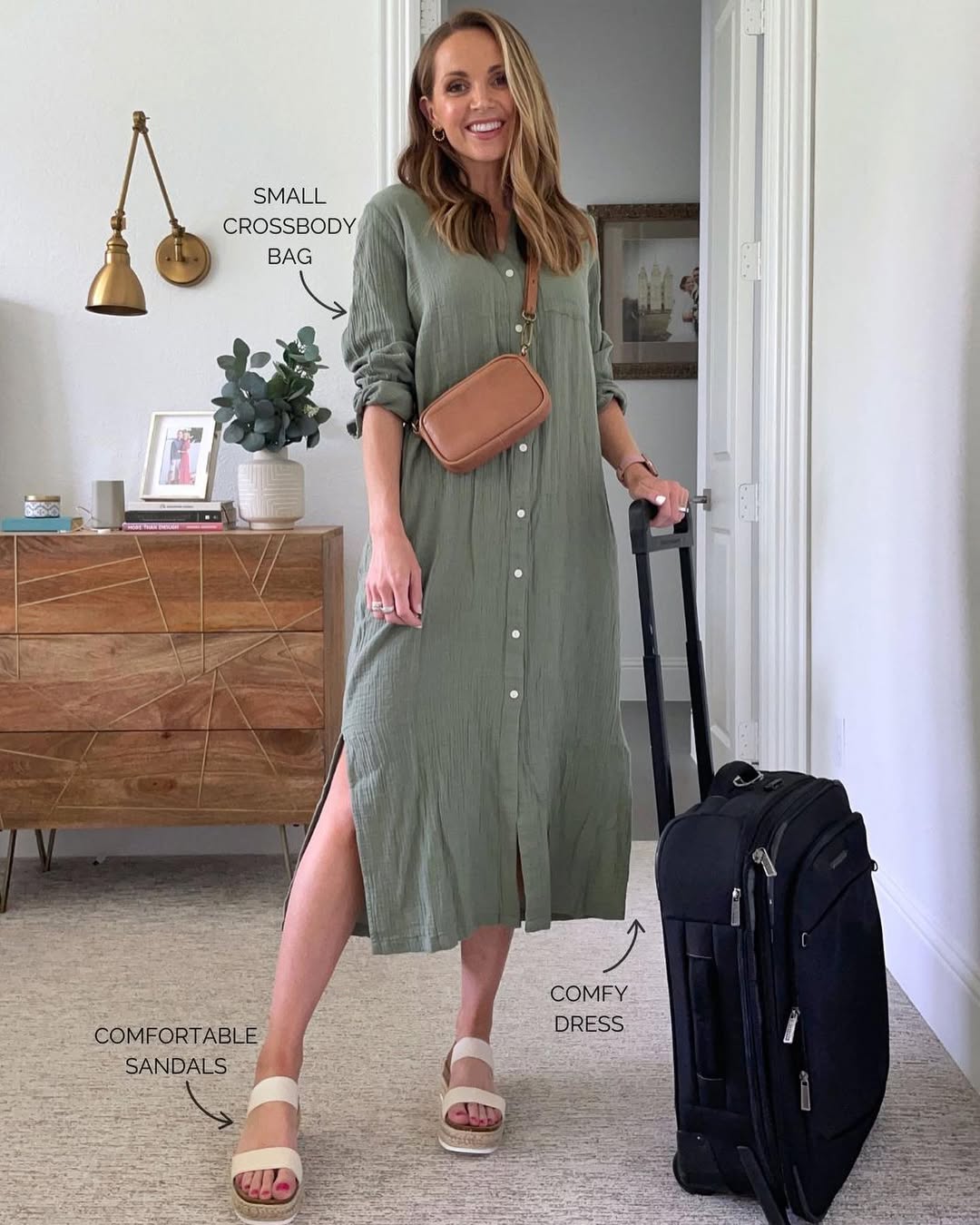 A flowy, button-front midi dress is an excellent, often overlooked, travel essential. It allows for comfortable movement and maintains a polished appearance upon arrival.