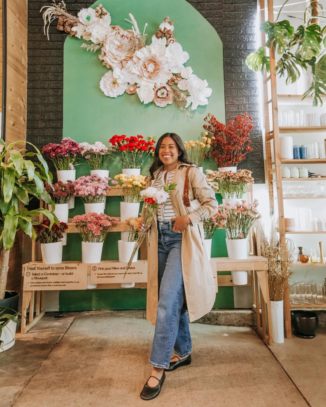 Holding a small bouquet in front of a wall of flowers turns a simple errand into a cinematic experience. The look is relaxed, grounded, and subtly stylish.