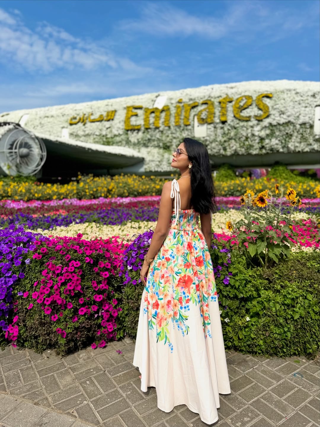 A flowing maxi dress adorned with vibrant floral prints in coral, blue, and green beautifully complements a garden setting, creating a picturesque travel moment.