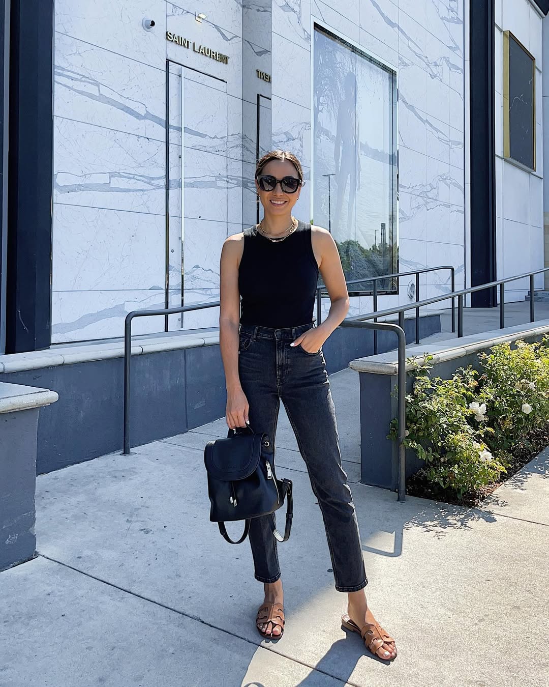 A black tank top tucked into charcoal straight-leg denim is a consistently successful combination. Adding brown leather sandals and a structured black backpack elevates the outfit, making it feel intentional, sharp, and sophisticated.