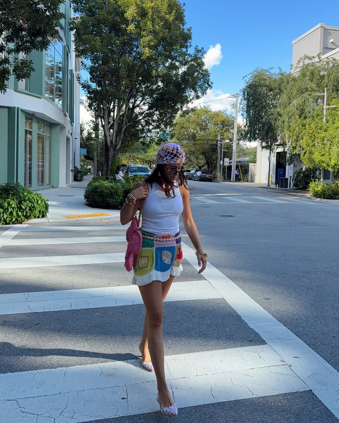This outfit is full of personality without being overwhelming. A simple white tank top serves as the foundation, while a brightly colored, patchwork mini skirt captures attention.