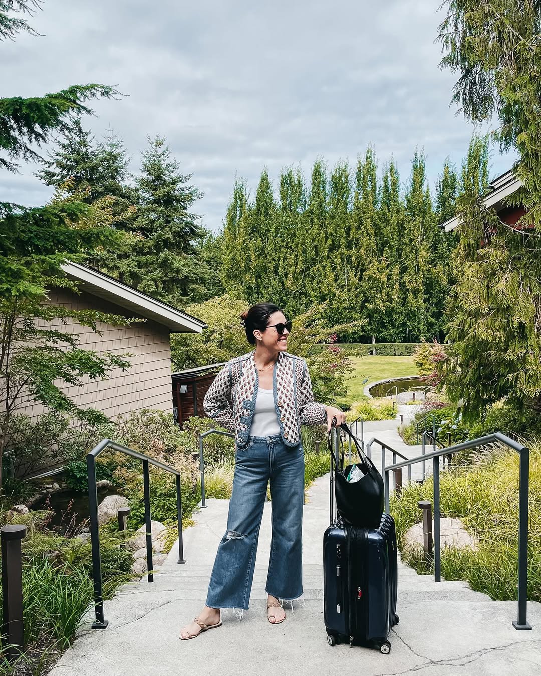 This ensemble offers a refreshing feel amidst the usual travel hustle. A patterned quilted jacket worn over a simple tank and wide-leg jeans provides a distinctive flair without appearing overdone.
