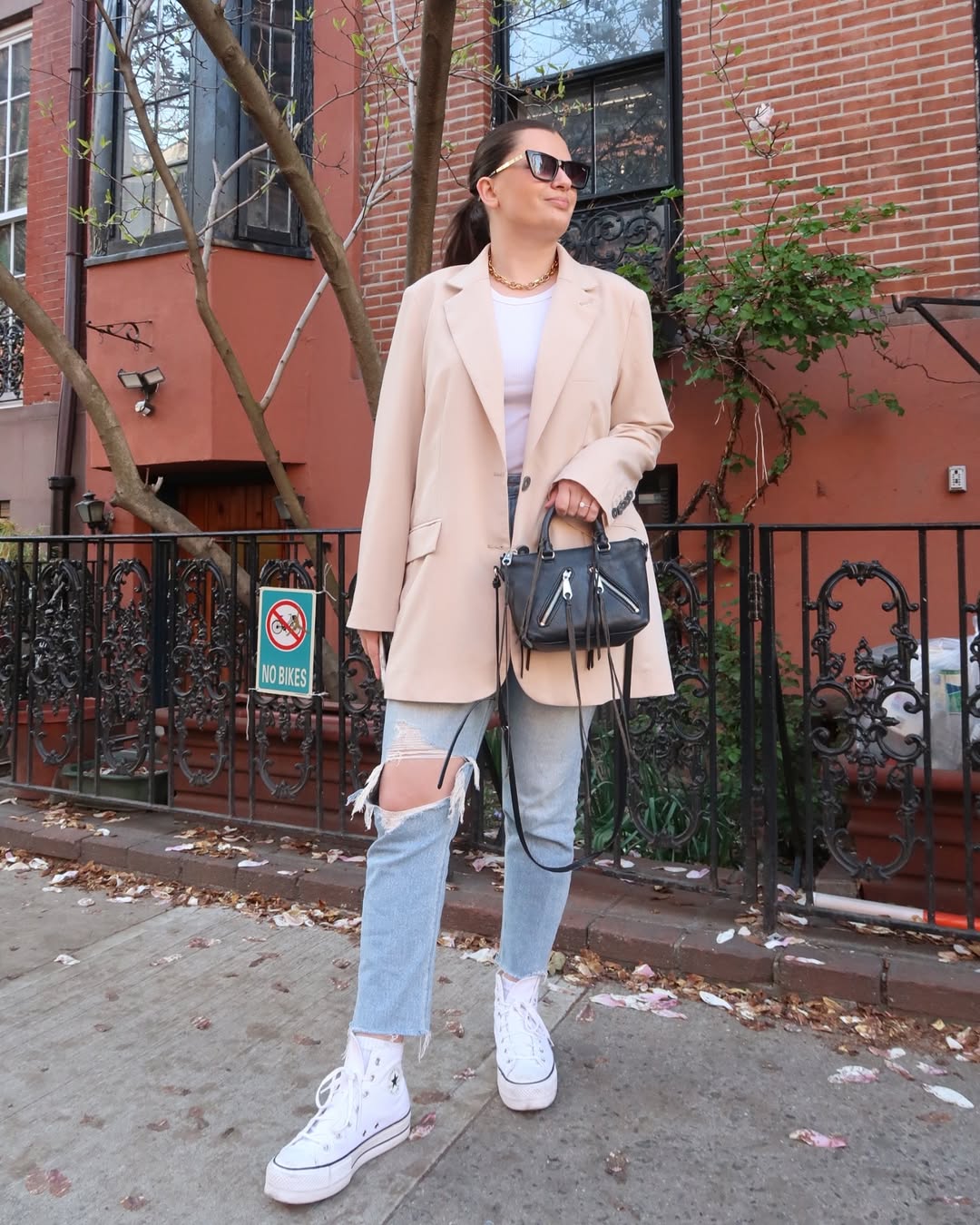 An oversized beige blazer layered over a simple t-shirt and distressed denim strikes a balance between relaxed and polished. A chunky gold chain and a sleek black mini bag sharpen the overall silhouette.