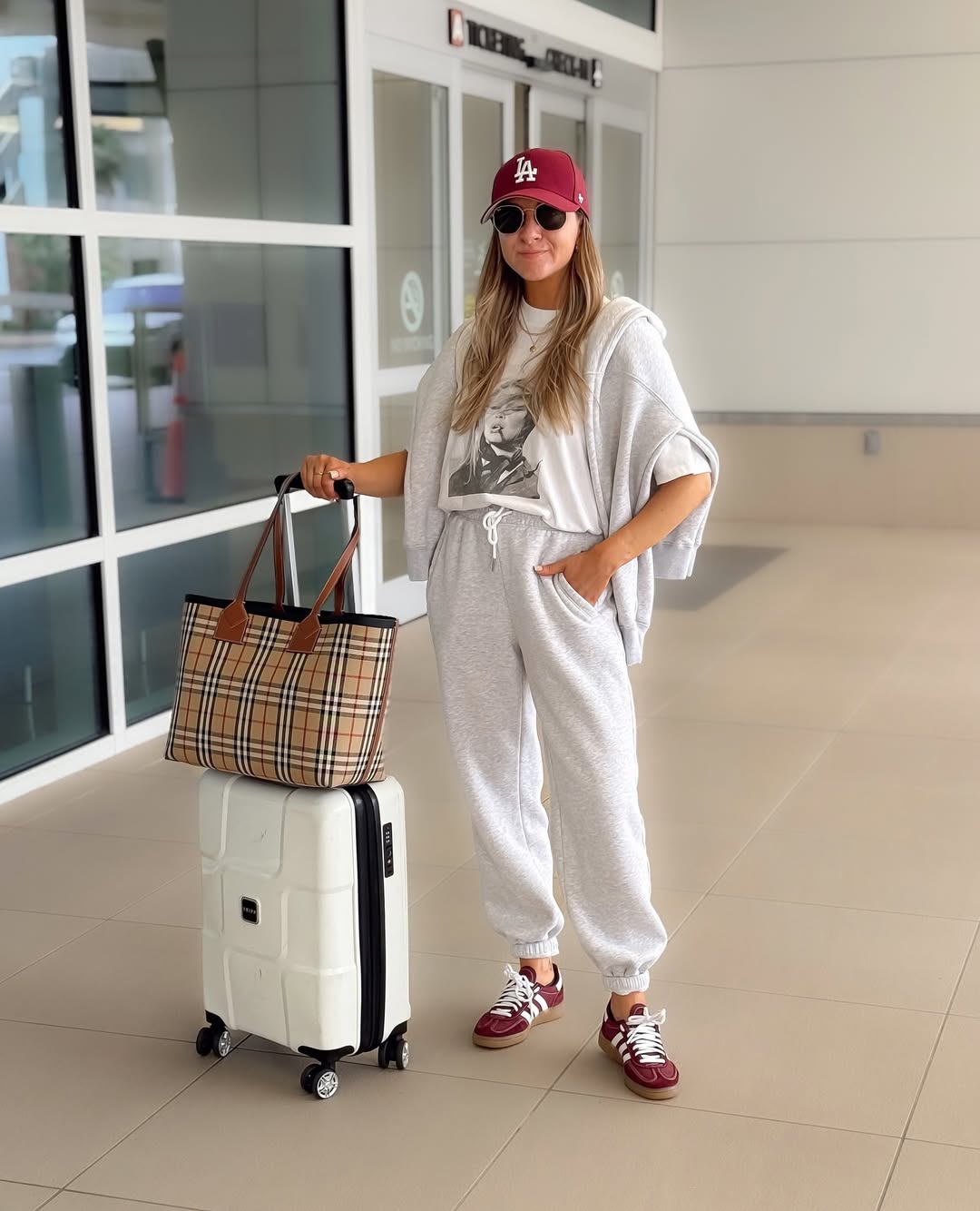 Matching grey sweatpants and a top, styled with a graphic tee and a standout cap, offers a look that is both relaxed and thoughtfully put-together. A plaid tote bag adds a classic touch that elevates the entire ensemble.