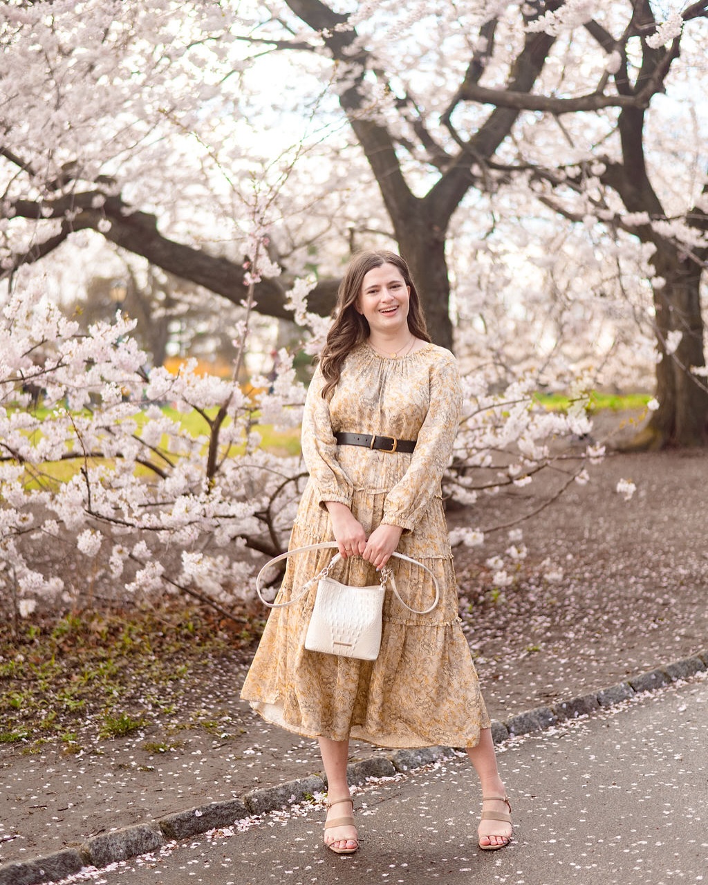 Against a backdrop of cherry blossoms, a tiered floral midi dress in soft beige tones, cinched with a belt, embodies romantic spring dressing.