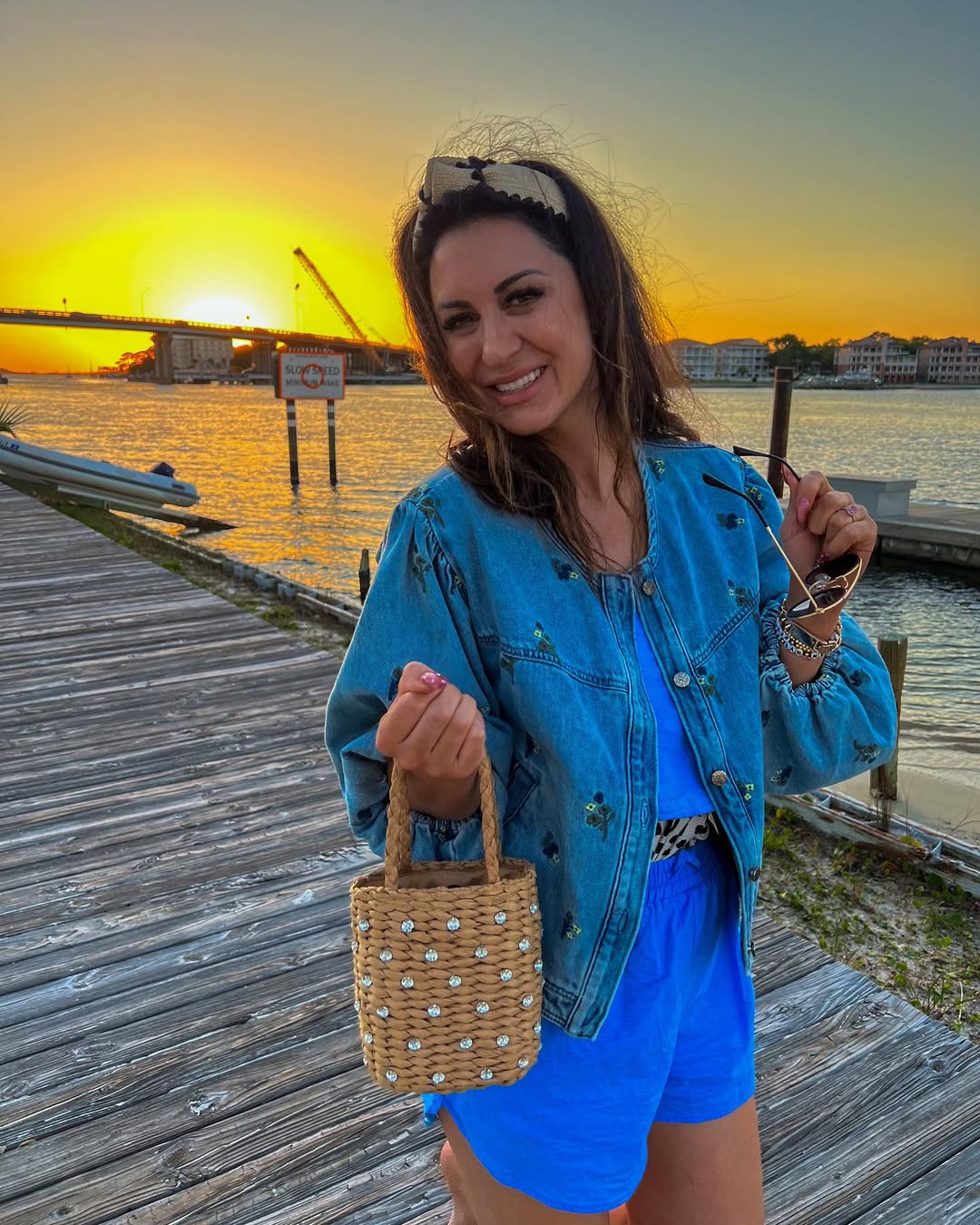 A vibrant blue dress set against a golden sunset creates a cinematic scene. A denim jacket adds a casual touch, while a woven bucket bag introduces texture.