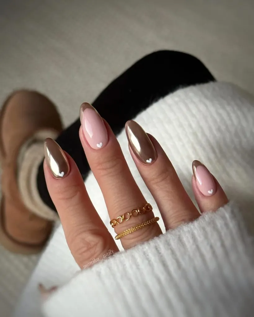 This design, featuring a blend of blush pink and chrome metallic tones, exudes effortless chic. Tiny heart details add a touch of sweetness, while the sleek finish maintains a mature and refined aesthetic. It’s a subtly romantic choice that feels personal, modern, and quietly luxurious.