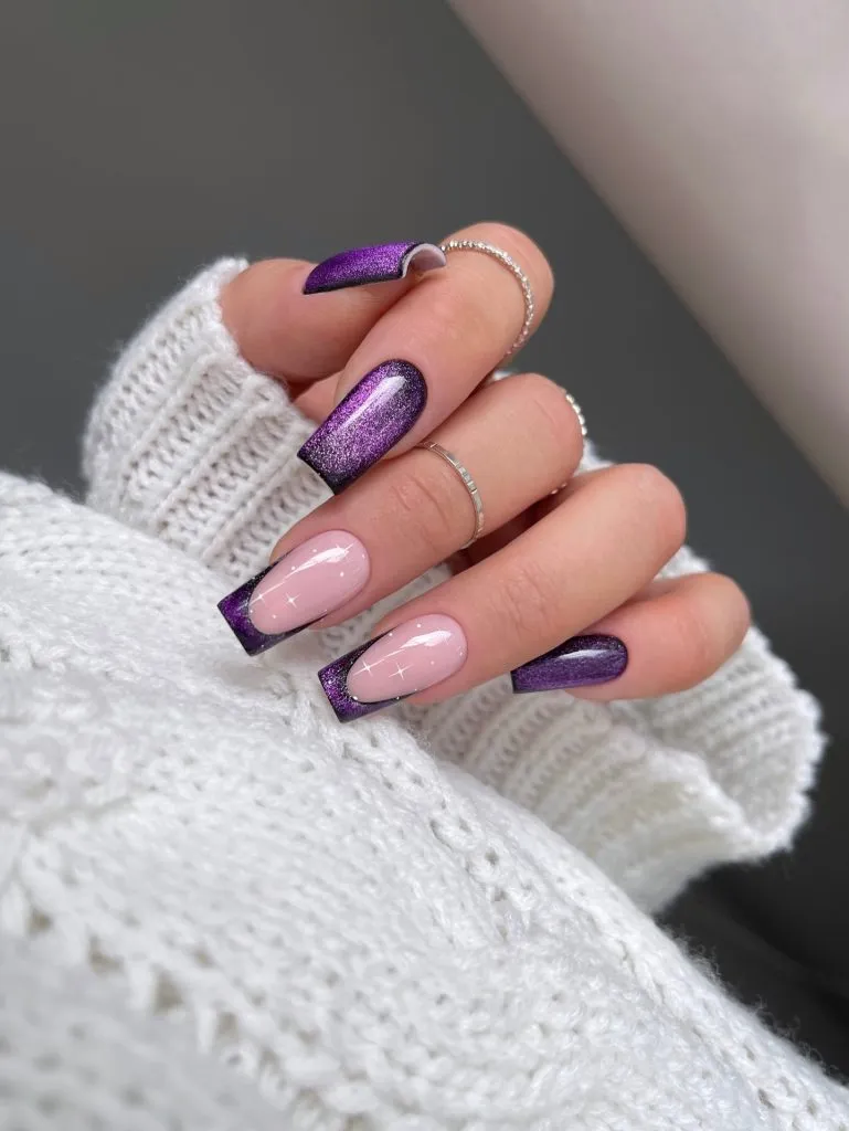 These nails offer a subtly dramatic flair. A soft nude base grounds the design, while shimmering amethyst tips provide a captivating, almost velvet-like glow. This combination strikes a balance between playfulness and sophistication, akin to pairing a soft knit with a distinctive accessory. It’s an excellent choice for those seeking a unique yet undeniably elite manicure.