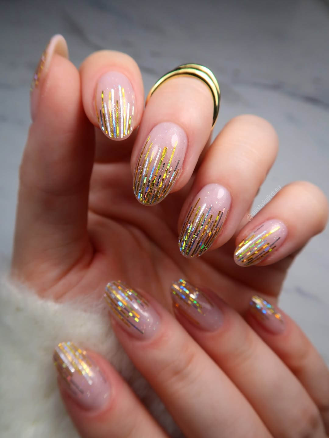These nails evoke the gentle shimmer of candlelight in motion. A sheer blush base maintains an airy feel, while fine gold foil striping provides just enough subtle shimmer to appear intentional and luxurious. The overall effect is delicately elegant and feminine, suitable for both casual moments with a coffee mug and more festive occasions with a champagne glass.