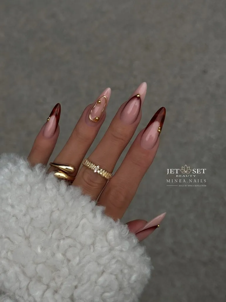 These nude almond nails are elevated with understated gold accents, including soft French edges, tiny metallic dots, and sculptural details that resemble delicate jewelry. They strike an ideal balance between subtlety and a special touch, making them perfect for daily wear with a luxurious finish.