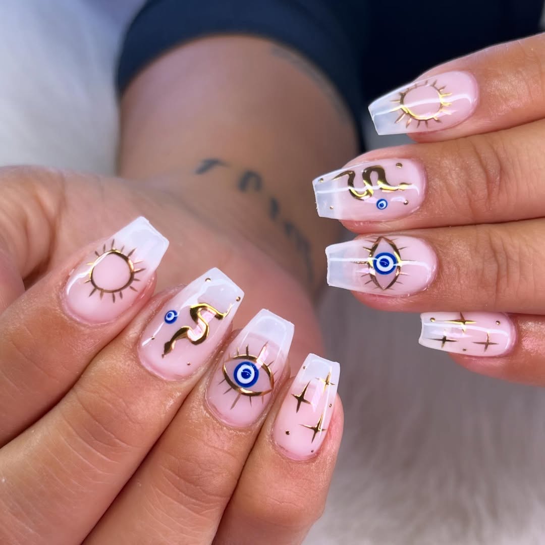 Golden detailing over a milky pink base lends this set a luxurious, almost talismanic quality. The symbols appear deliberate and refined, adding intrigue without detracting from the overall design. This manicure feels particularly special, serving as exquisite jewelry for your hands.