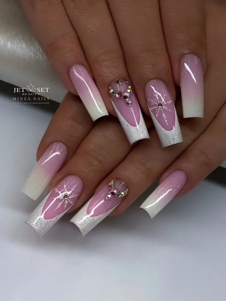 Offering a wintery take on glamour, this pink-and-white ombré set is adorned with snowflake motifs and crystal embellishments. The soft gradient creates a dreamy effect, while the decorative elements add a festive touch. It conveys a delicate, romantic feel, perfectly complementing cozy cold-weather ensembles and polished moments.