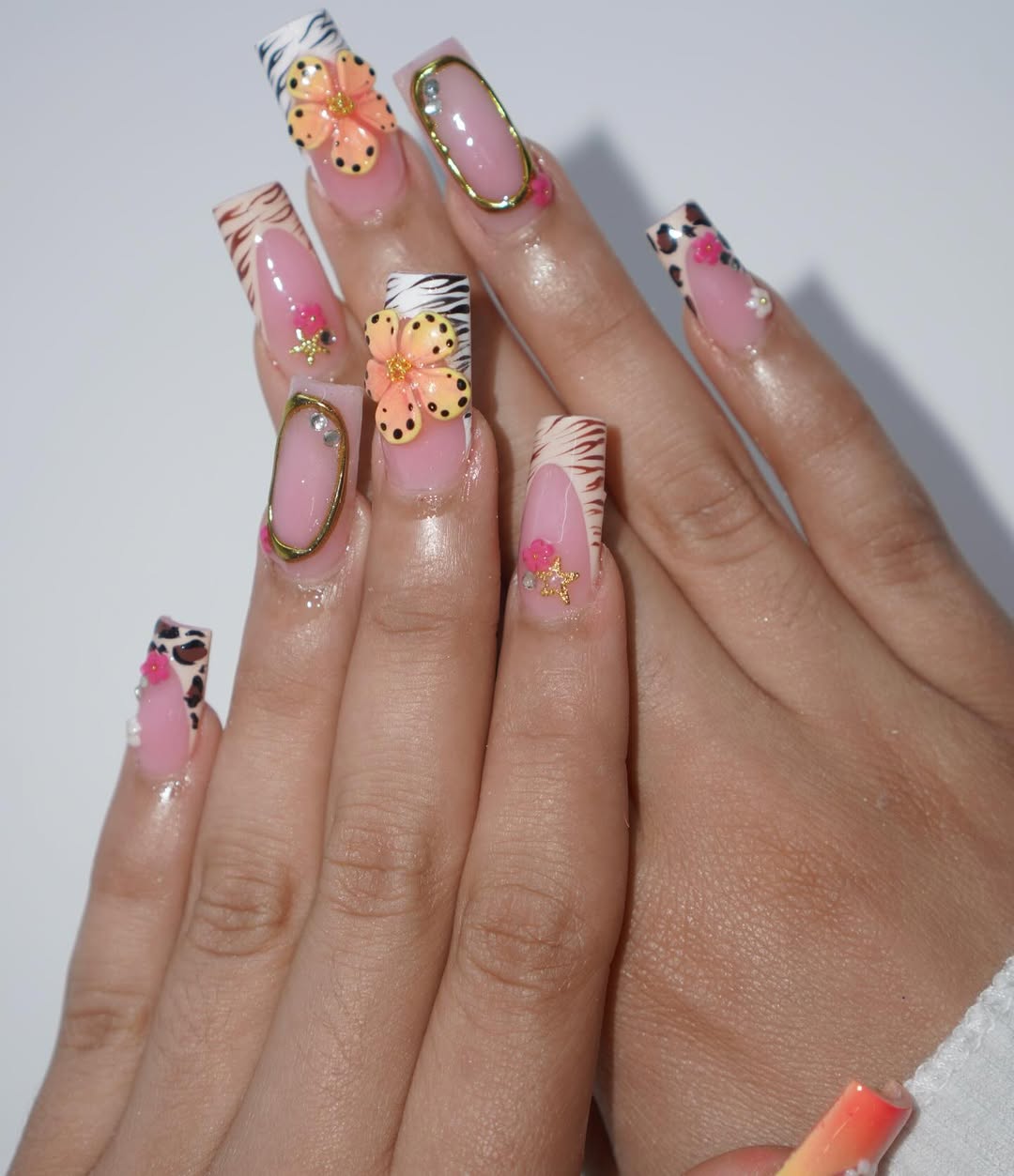This set embraces bold glamour with a medley of floral patterns, animal print accents, gold framing, and crystal details. The soft pink base acts as a unifying element, ensuring cohesion rather than a cluttered appearance. It’s an unapologetically decorative choice, perfect for those who adore statement nails that feel curated and artful.