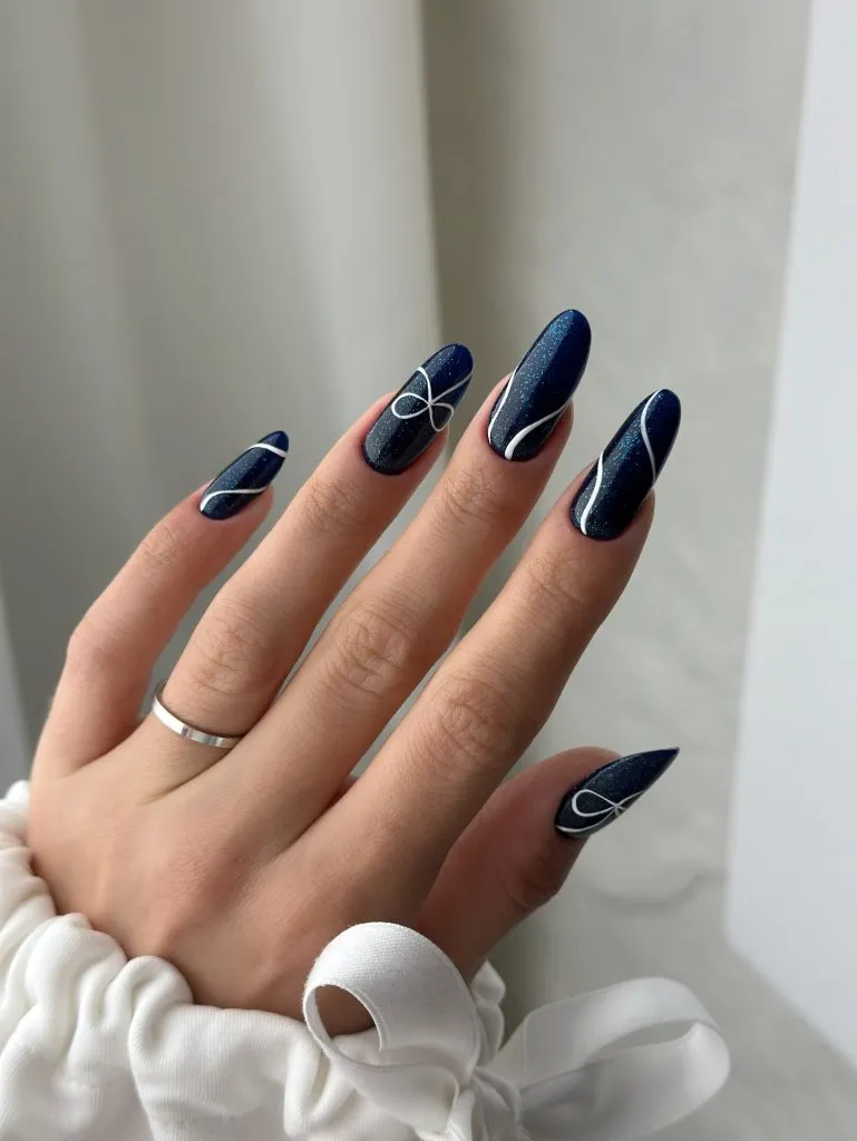 Deep navy nails featuring fine white linework offer a modern, graphic, and subtly mysterious aesthetic. A hint of shimmer in the base adds depth without distracting from the design. This look is sleek and fashion-forward, suitable for those who prefer bold yet refined nails that integrate seamlessly into an elevated, minimalist wardrobe.