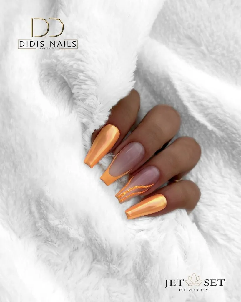 This design merges warm peach chrome with a translucent nude base, creating a luminous and contemporary look. The metallic finish beautifully catches the light without overpowering the overall aesthetic, maintaining an elevated and sleek appearance. It offers a fresh, editorial feel, ideal for those who appreciate soft colors enhanced with a touch of luxury, embodying quiet luminescence.
