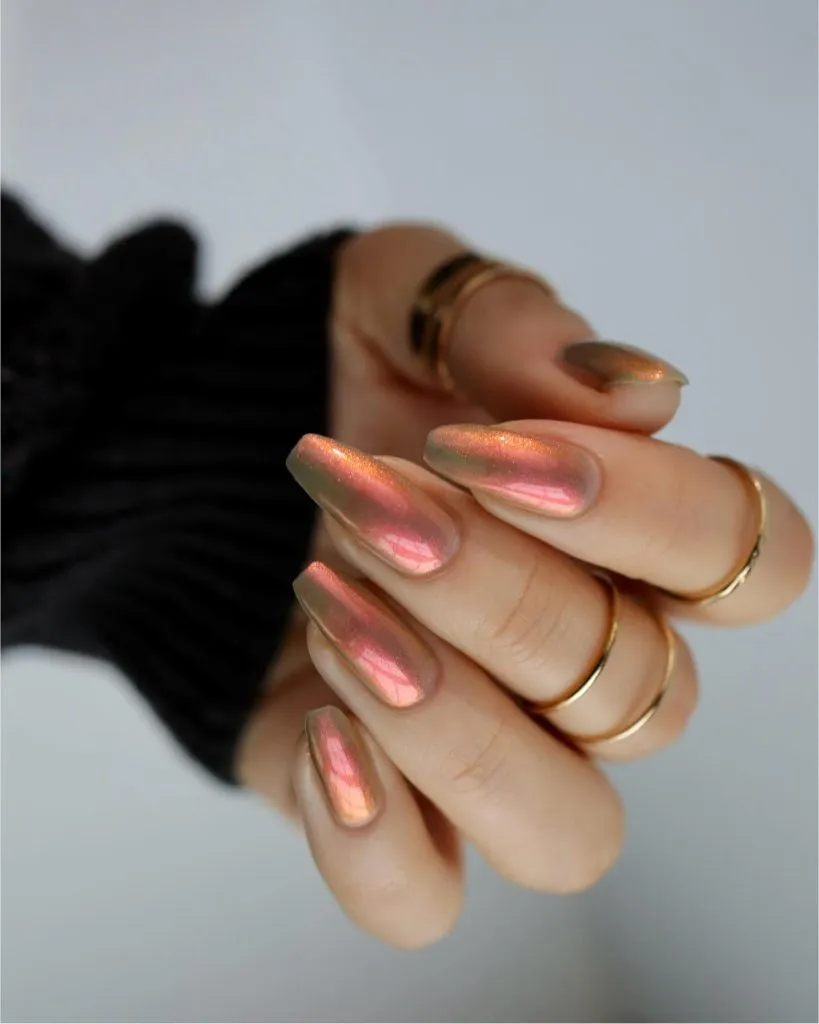 Soft rose-gold chrome imbues these nails with a liquid-metal effect that is both warm and futuristic. The almond shape perfectly balances the high shine, ensuring the look remains elegant rather than overwhelming. This set possesses an effortlessly cool quality, like minimalist jewelry with a sophisticated, high-shine twist—subtle, elevated, and universally appealing.