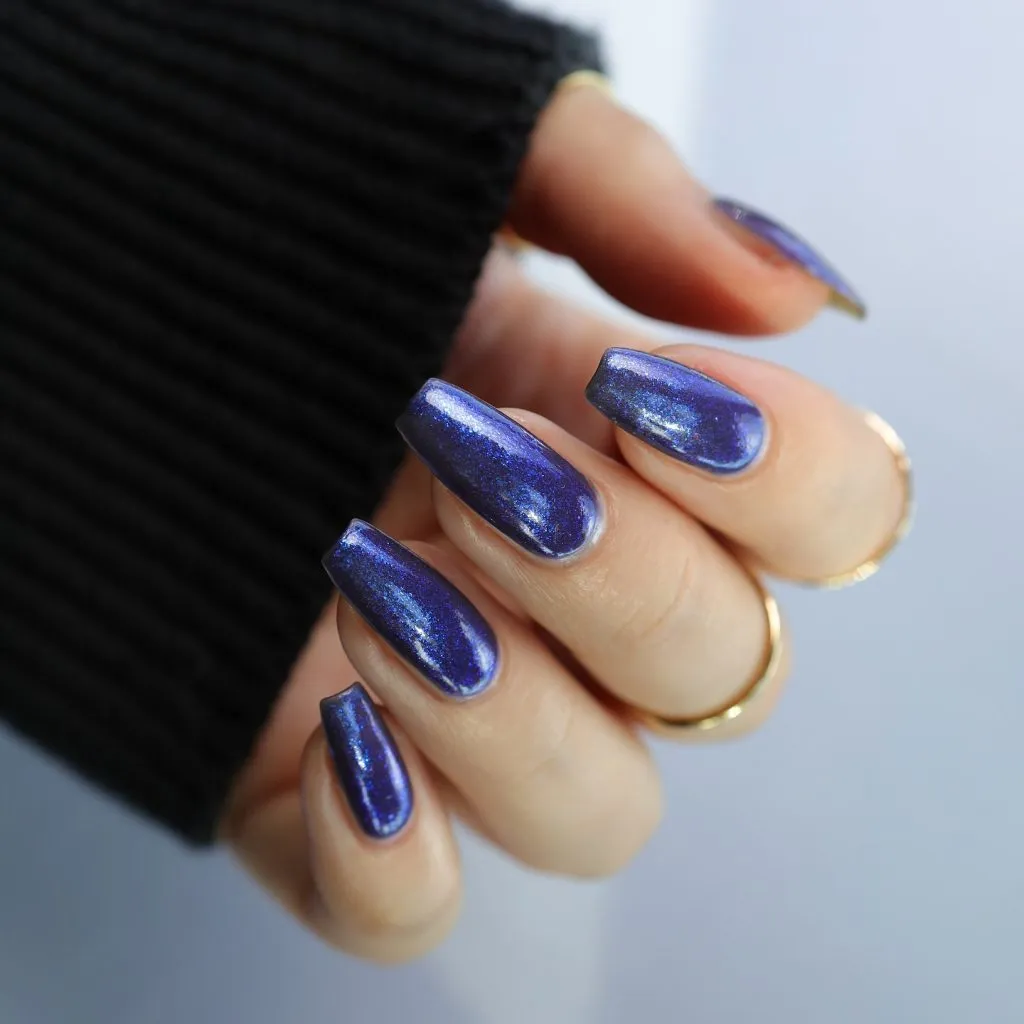 This deep blue shimmer offers a rich, bold, yet surprisingly refined appearance. The metallic finish captures light beautifully, lending the nails a jewel-like depth that feels both powerful and polished. It’s a confident choice, presenting a sleek, modern look that is particularly well-suited for cooler seasons or evening events where you want your nails to command subtle attention.