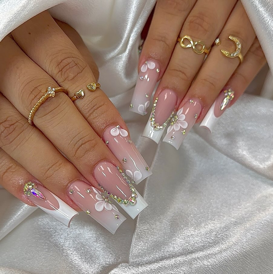 Imagine nails that capture the romance of an elegant evening, akin to wrapping your hands in soft satin. A delicate blush pink base provides a timeless foundation, enhanced by pristine white French tips. The true luxury is revealed in the intricate floral details and understated crystal accents, elevating the entire look to one of pure sophistication. These nails possess an “effortlessly chic” quality, whispering luxury rather than shouting it, ideal for those who appreciate classic beauty with a hint of sparkle.